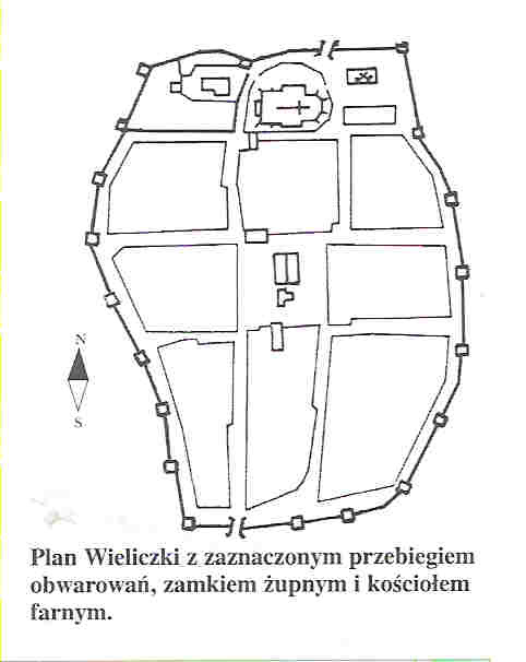 Mury obronne miasta zaczęto wznosić w II połowie XIV wieku. Długość murów przekraczała 1000m obejmując obszar prawie 8ha. Miasto otaczała głęboka fosa. Mury i baszty zostały wzniesione na naturalnym wzgórzu. Od wewnątrz ich wysokość nie przekraczała 8m, od zewnątrz były wyższe o kilka metrów w zależności od miejsca. Co 60m znajdują się czworoboczne kamienno ceglane baszty zamknięte od środka. Od południa do miasta prowadziła brama Kłosowska, od północy Krakowska. Mury miejskie rozebrano w XIX wieku.