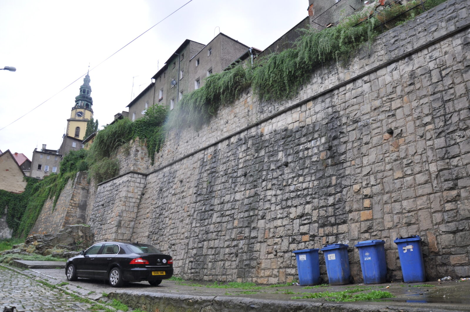 Prawa miejskie Bystrzyca Kłodzka posiada od XIII wieku. Mury obronne zostały wzniesione z kamienia ok. 1319 r. Restaurowane i poprawiane w ciągu następnych stuleci, posiadały dwie bramy: Kłodzką i Wodną, a od 1580 r. trzecią, Nową, oraz szereg baszt. Rozbiórkę fortyfikacji rozpoczęto od 1840 r., tak że obecnie pozostały jedynie ich fragmenty, remontowane i konserwowane w latach 1960 - -1962. Zachowała się kamienna brama Wodna, założona na rzucie prostokąta, z ostrołukowym przejazdem i stożkowym hełmem. Z bramy Kłodzkiej pozostała jedynie kwadratowa wieża, a ocalałą wieżę Rycerską przerobiono w 1843 r. na dzwonnicę pobliskiego kościoła ewangelickiego.