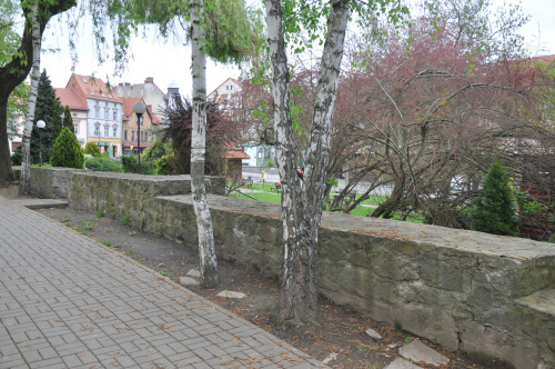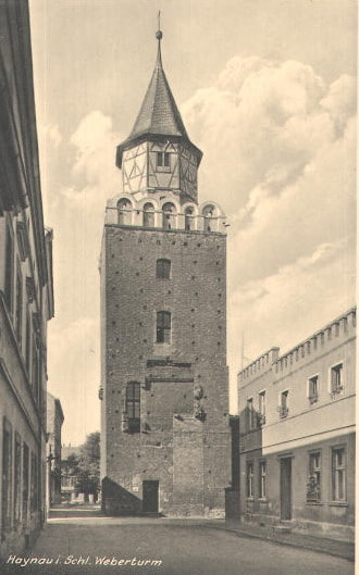 Osada powstała przed 1288 i nosiła nazwę Haynow, prawa miejskie otrzymała w 1333 roku. Mury obronne wzniesiono w pierwszej połowie XIV wieku. Linia pojedyńczego pierścienia umocnień wzmocniona była basztami i chroniona głęboką fosą. Mury zostały odnowione i częściowo wzmocnione w połowie XV wieku. Zniszczone prawie całkowicie przez armię francuską w 1813 roku. Pierwotnie posiadały dwie bramy: górną Bolesławiecką i dolną Legnicką; dwie furty: południową Kamienną (zamurowaną w 1650 r.) i północną oraz szereg baszt. Obecnie pozostały jedynie niewielkie fragmenty dawnego pierścienia murów oraz gotycka baszta Tkaczy, zbudowana, z cegły na rzucie kwadratu, z ośmioboczną nadbudówką o konstrukcji szkieletowej, zwieńczoną hełmem odnawianym w 1651, 1749, 1843 i 1967 r. Na ścianach wieży widoczne ślady dawnej wysokości murów miejskich. Do dnia dzisiejszego zachowały się jedynie bardzo nieliczne odcinki dawnego pierścienia murów oraz Baszta Tkaczy. miasto na rycinie Wernera z XVIII wieku