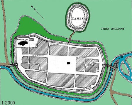 Mapa średniowiecznych Kątów wg Kurta Bimlera z naniesionym systemem fortyfikacyjnym.