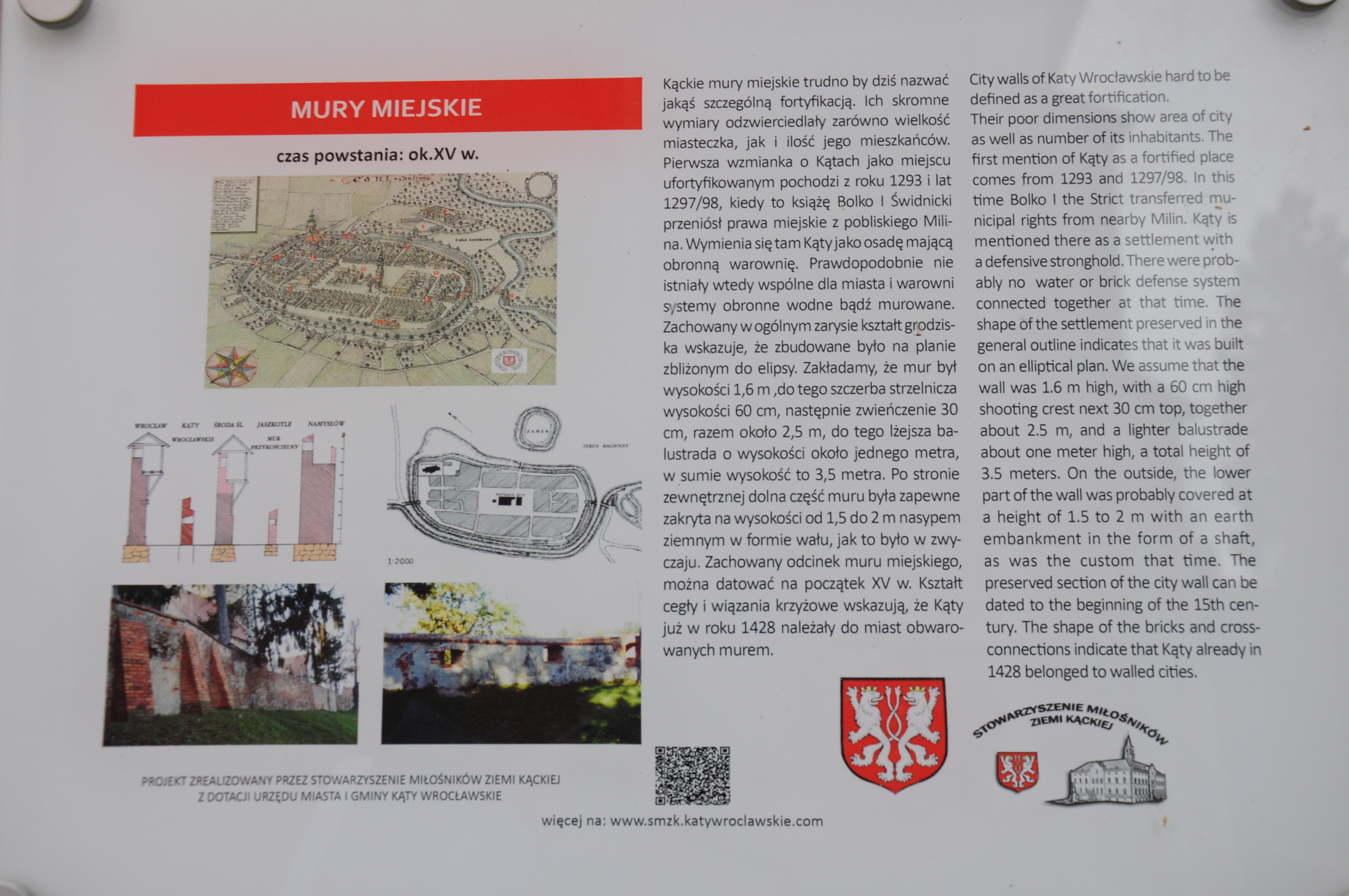 Mury w Kątach miały owalny zarys. Do miasta prowadziły dwie bramy: Dolna (zwana też Młyńską i Wrocławską), na zachodzie Górna (lzwana też Szpitalną lub Świdnicką).