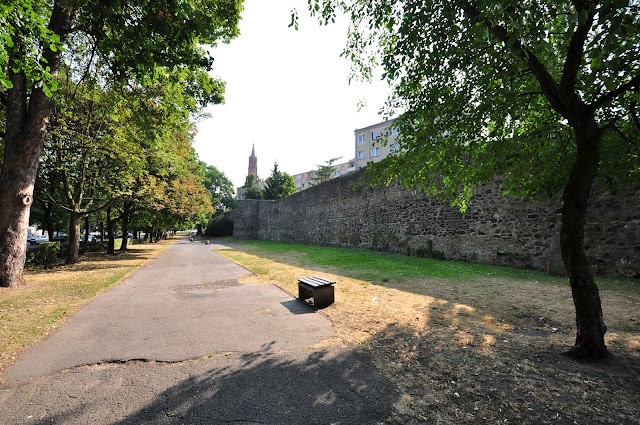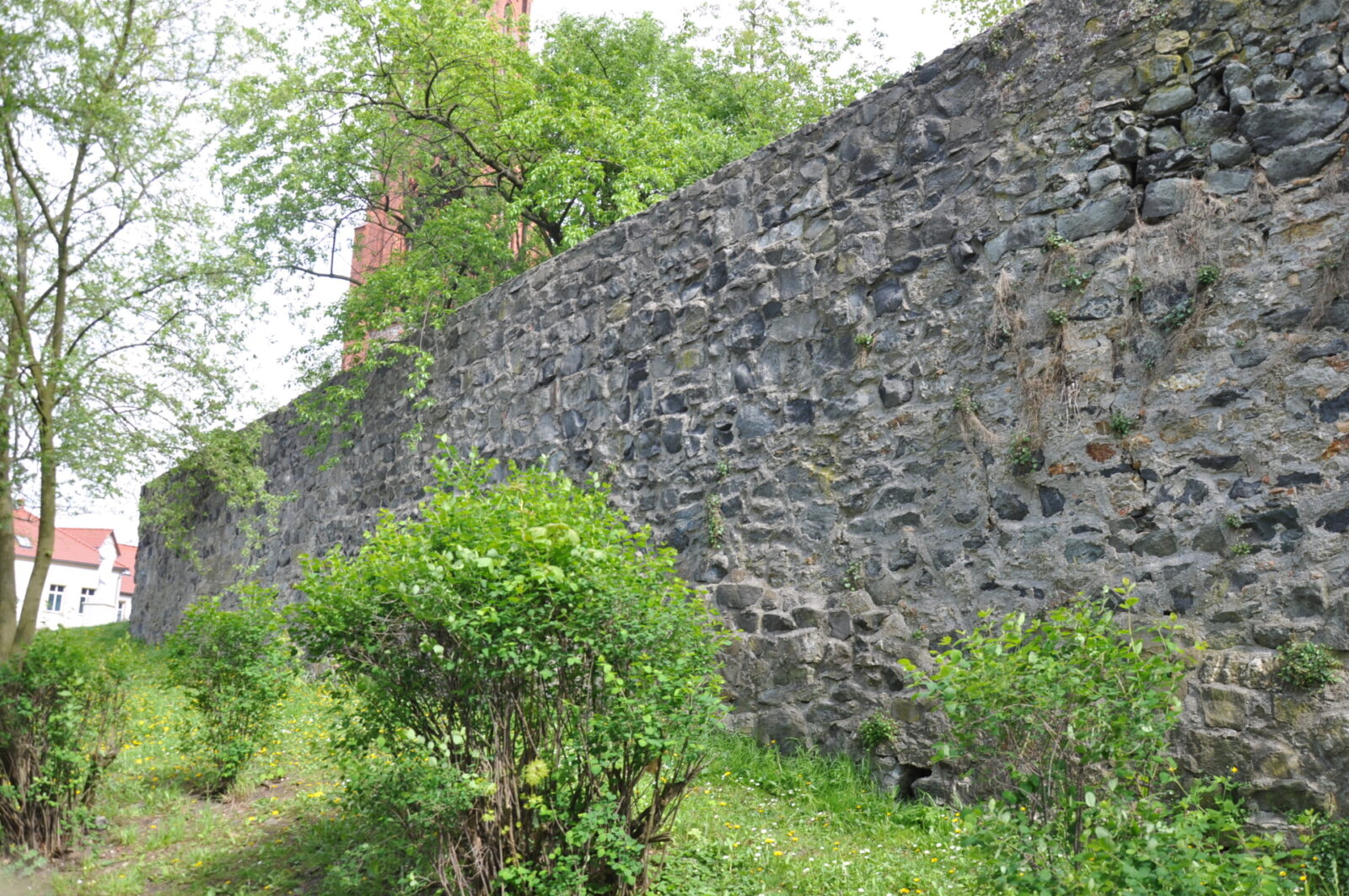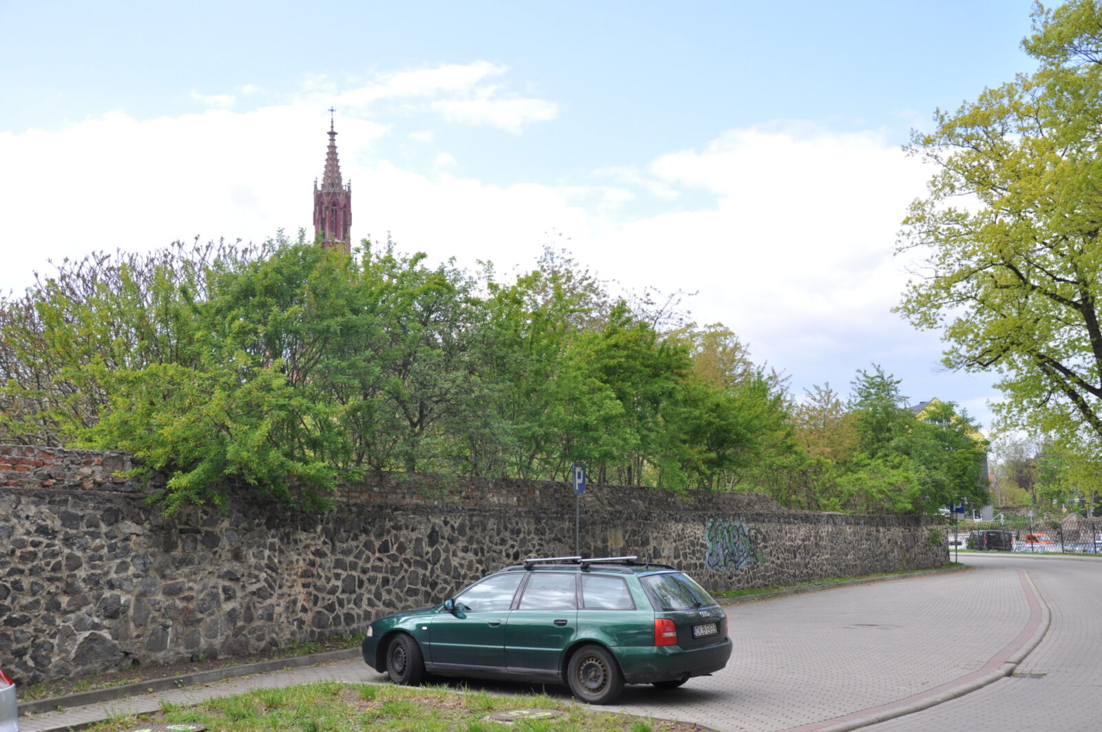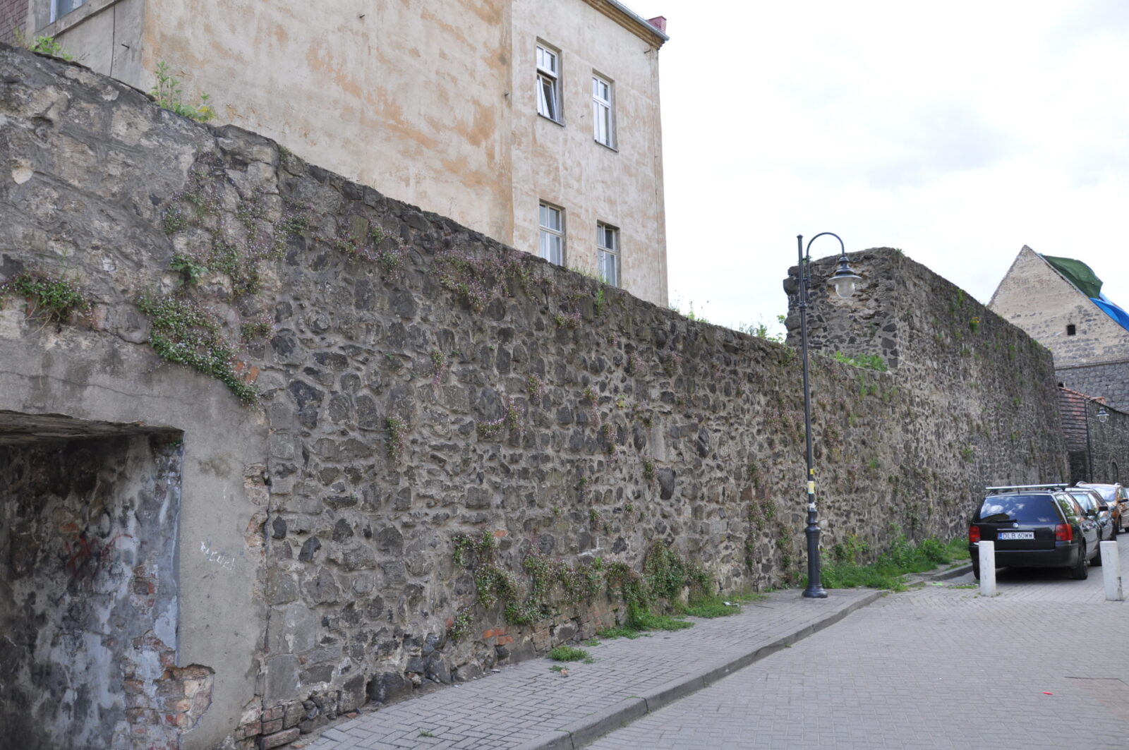 Mury wzdłuż ul. Podwale, zachodnia strona miasta, na wysokości targowiska miejskiego i neogotyckiego kościoła.