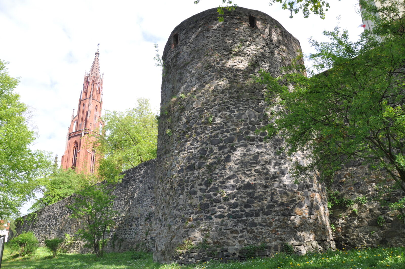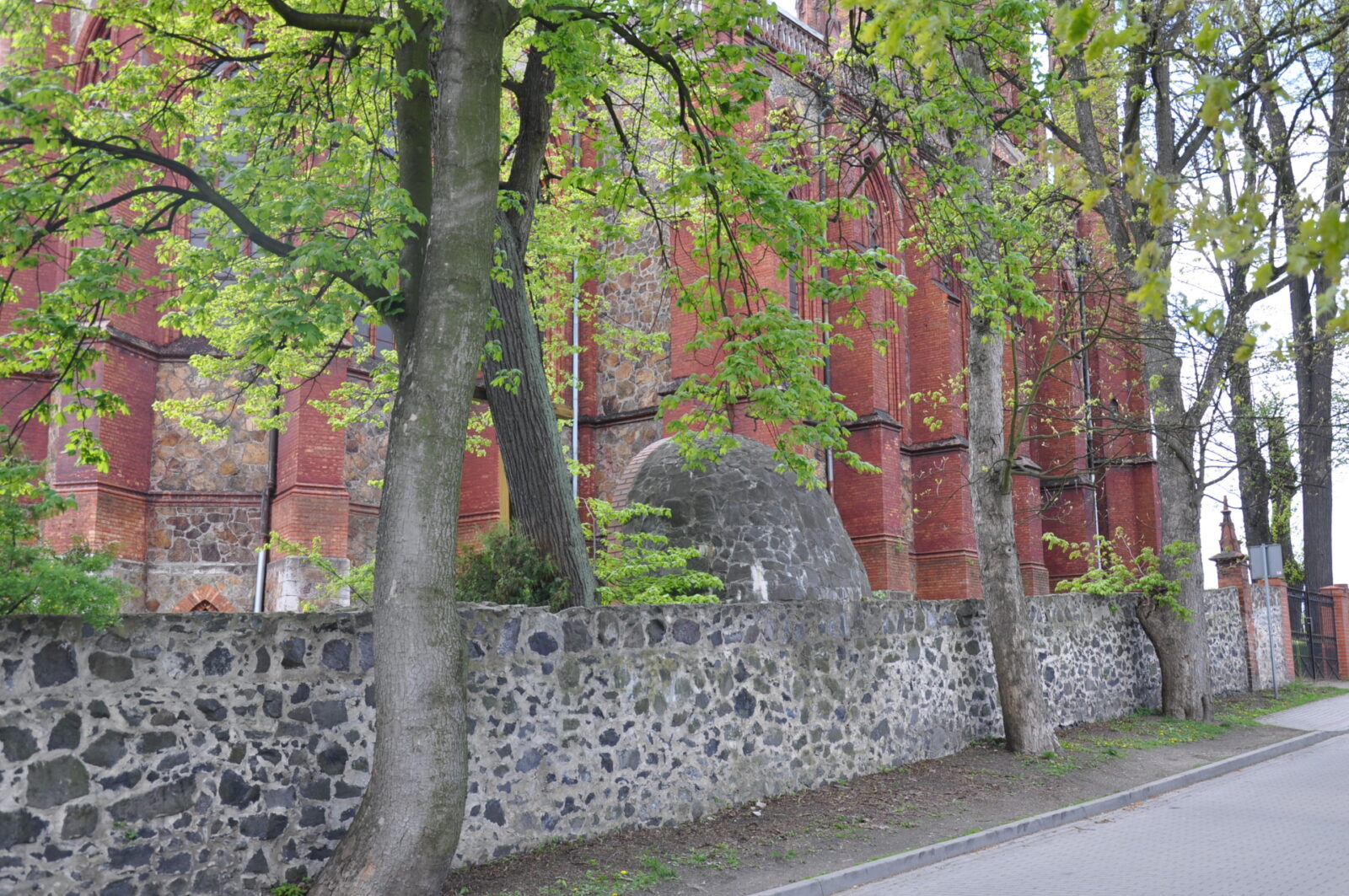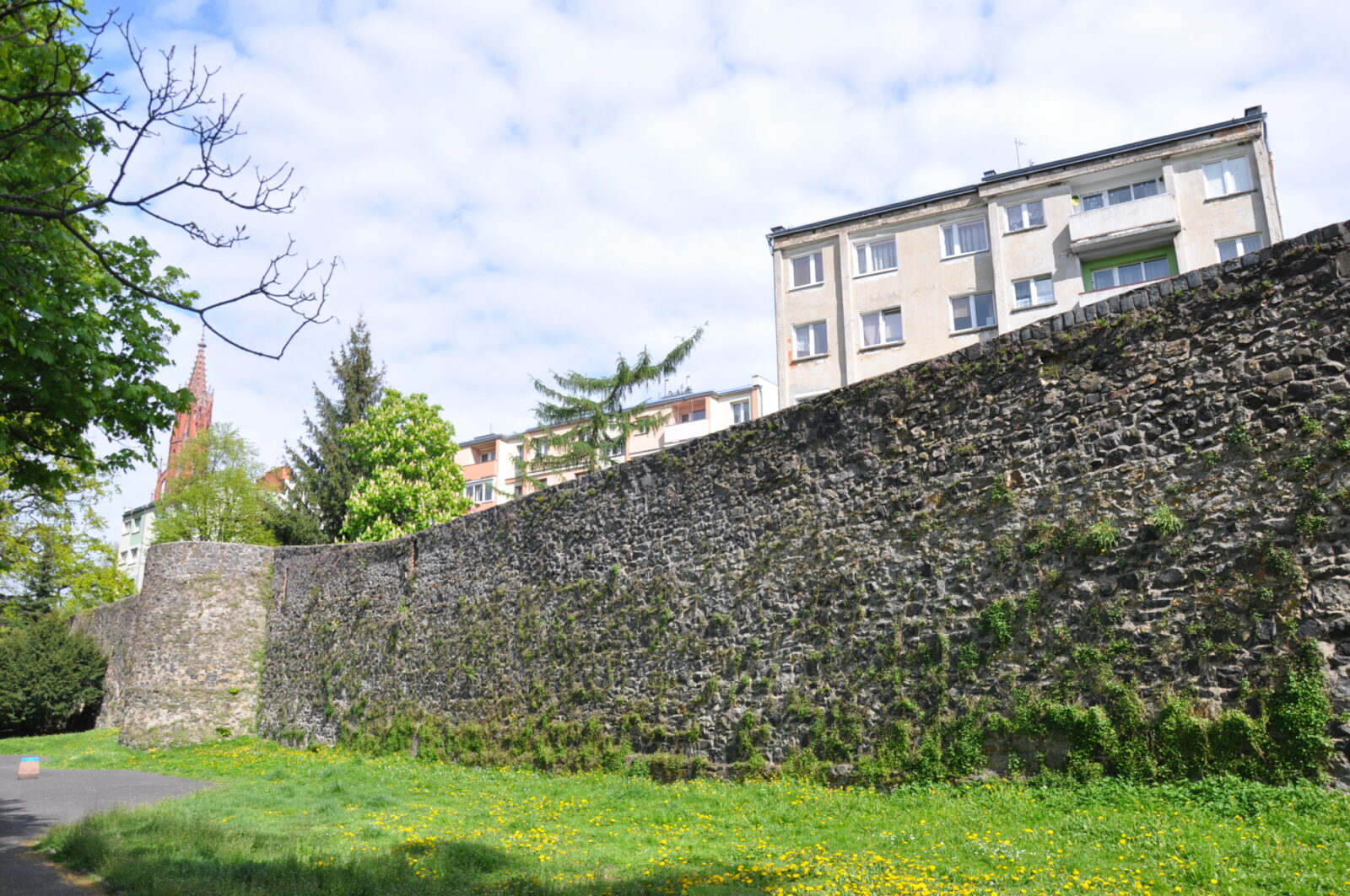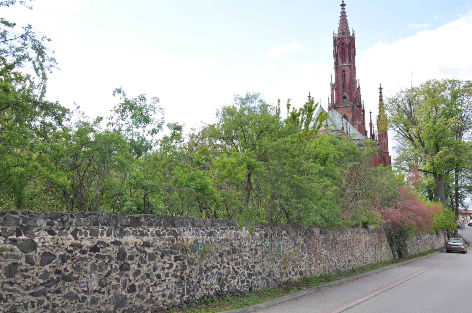 Mury wzdłuż ul. Podwale, zachodnia strona miasta, na wysokości targowiska miejskiego i neogotyckiego kościoła.