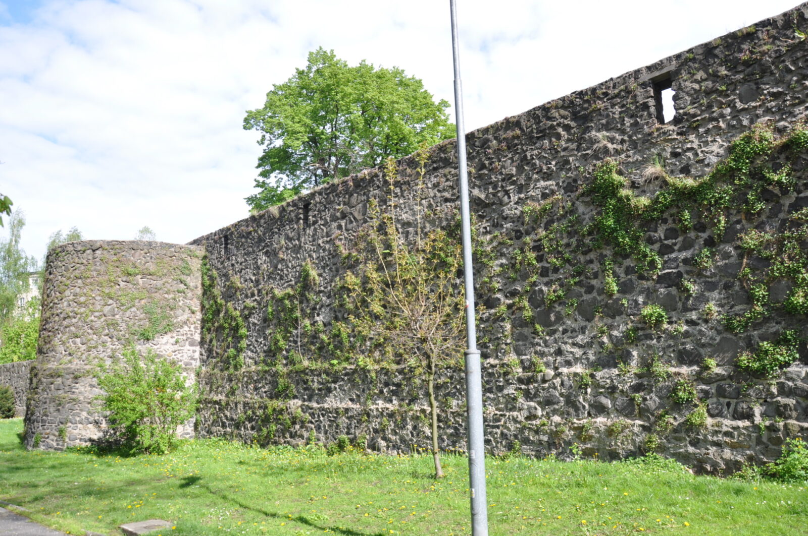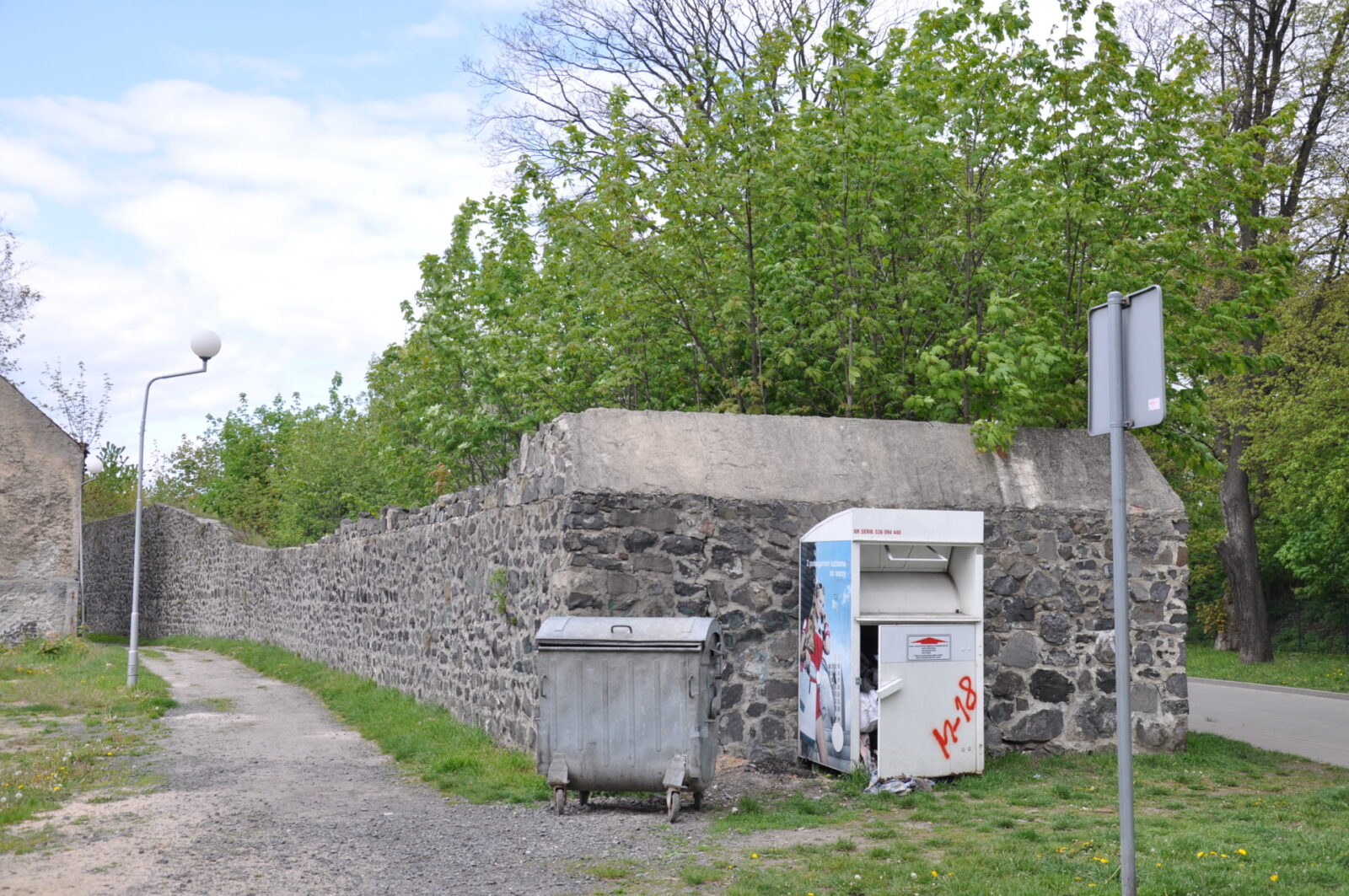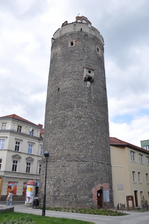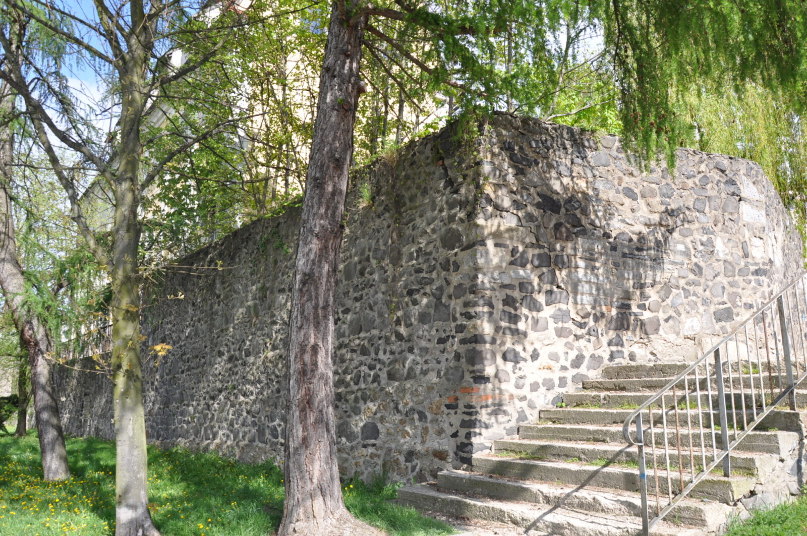 Mury wzdłuż ul. Podwale, zachodnia strona miasta, na wysokości targowiska miejskiego i neogotyckiego kościoła.