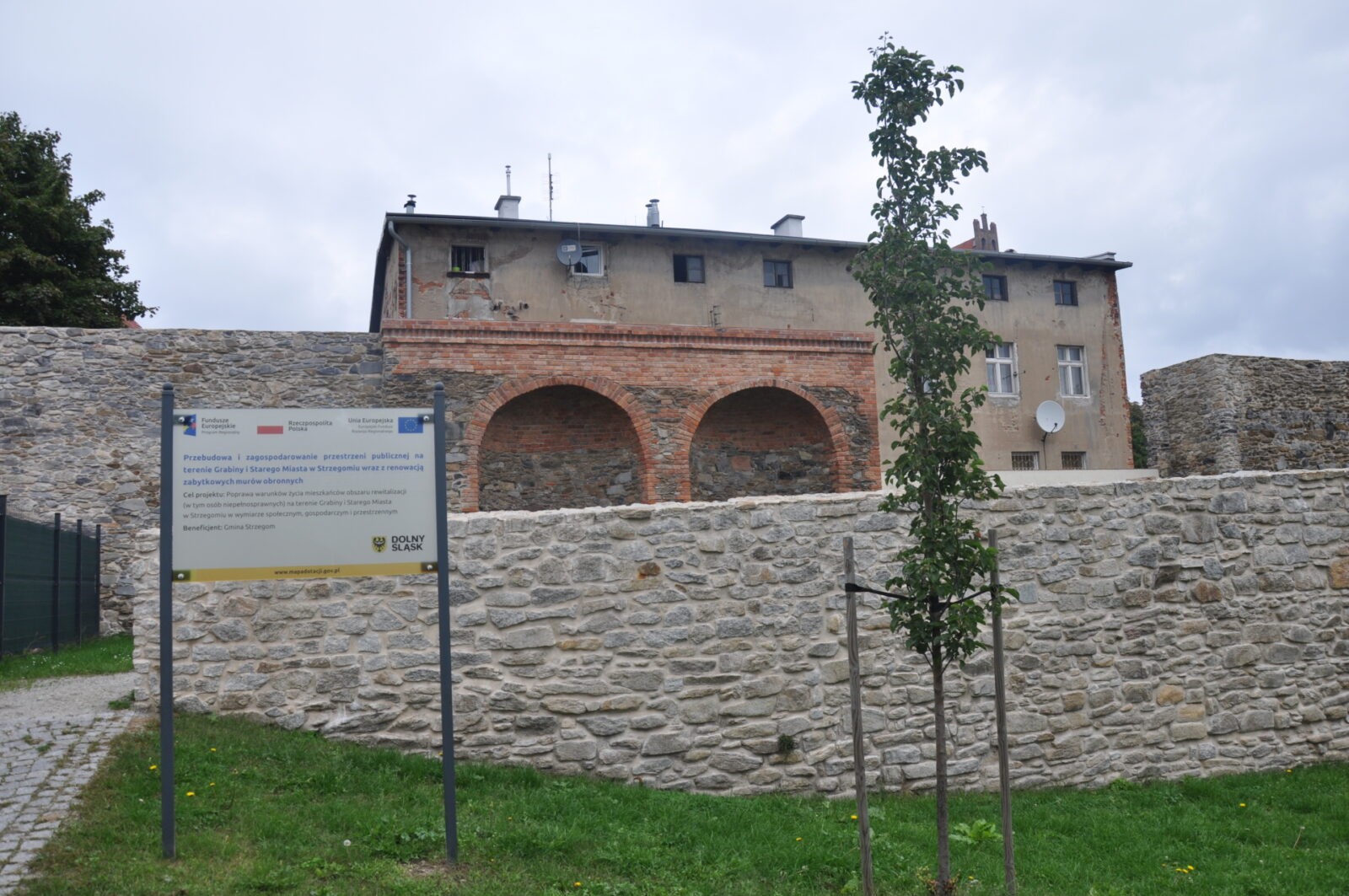Obok grodu warownego, pełniącego funkcje obronne, rozwinęła się także osada miejska zwana Starym Strzegomiem. W 1149 roku biskup wrocławski konsekrował tu pierwszy kościół. W 1202 roku komes Imbram, kasztelan strzegomski, przekazuje joannitom kościół wraz z przynależnościami. Dokumentami potwierdzającymi tę darowiznę (akt dotacyjny z lat 1202-1203, dyplom księcia Henryka Brodatego, oraz 2 dyplomy Cypriana – biskupa [wrocławskiego) potwierdzają istnienie i podkreślają rangę dawnego Strzegomia. Po tym, jak w 1241 r. Tatarzy spalili gród, wdowa po Henryku Pobożnym, Anna, lokowała tu miasto na prawie niemieckim i ściągnęła kolonistów aby przyspieszyć odbudowę ośrodka. W 1291 roku miasto znalazło się w nowo powstałym księstwie świdnicko-jaworskim, którym rządził Bolko I. Z jego polecenia wokół miasta wzniesiono mury obronne w latach 1291-1299. Zostały gruntownie przebudowane i powiększone w XIV wieku kiedy to wybudowano drugi zewnętrzny pas w 1454 r. W ciągu murów było pięć bram: Świdnicka, Jaworska, Wrocławska, Grabińska, Nowa oraz baszty. Pod koniec XV wieku wzniesiono wydłużone basteje. W 1683 r. nastąpiła reperacja umocnień po zniszczeniach wojennych. Niszczone na materiał budowlany w XIX wieku zachowały się obecnie w niewielkich fragmentach wzdłuż promenady. Oprócz kaplicy Św. Antoniego umieszczonej w dawnej bastei, odbudowanej po zniszczeniach wojennych w latach 1957-1961, zachowała się jeszcze baszta Dziobowa (ul. Kamienna), wzniesiona przed 1398 r. zbudowana na rzucie czworobocznym, wyżej przechodząca w ośmiobok zwieńczony stożkowym hełmem.