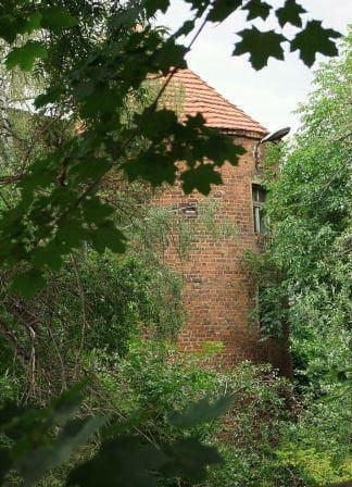 Druga z zarośniętych baszt od strony podwórka i kawałek muru z blankami.
