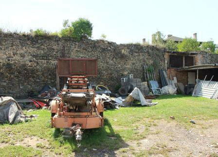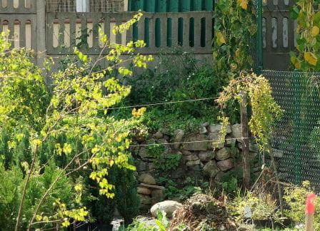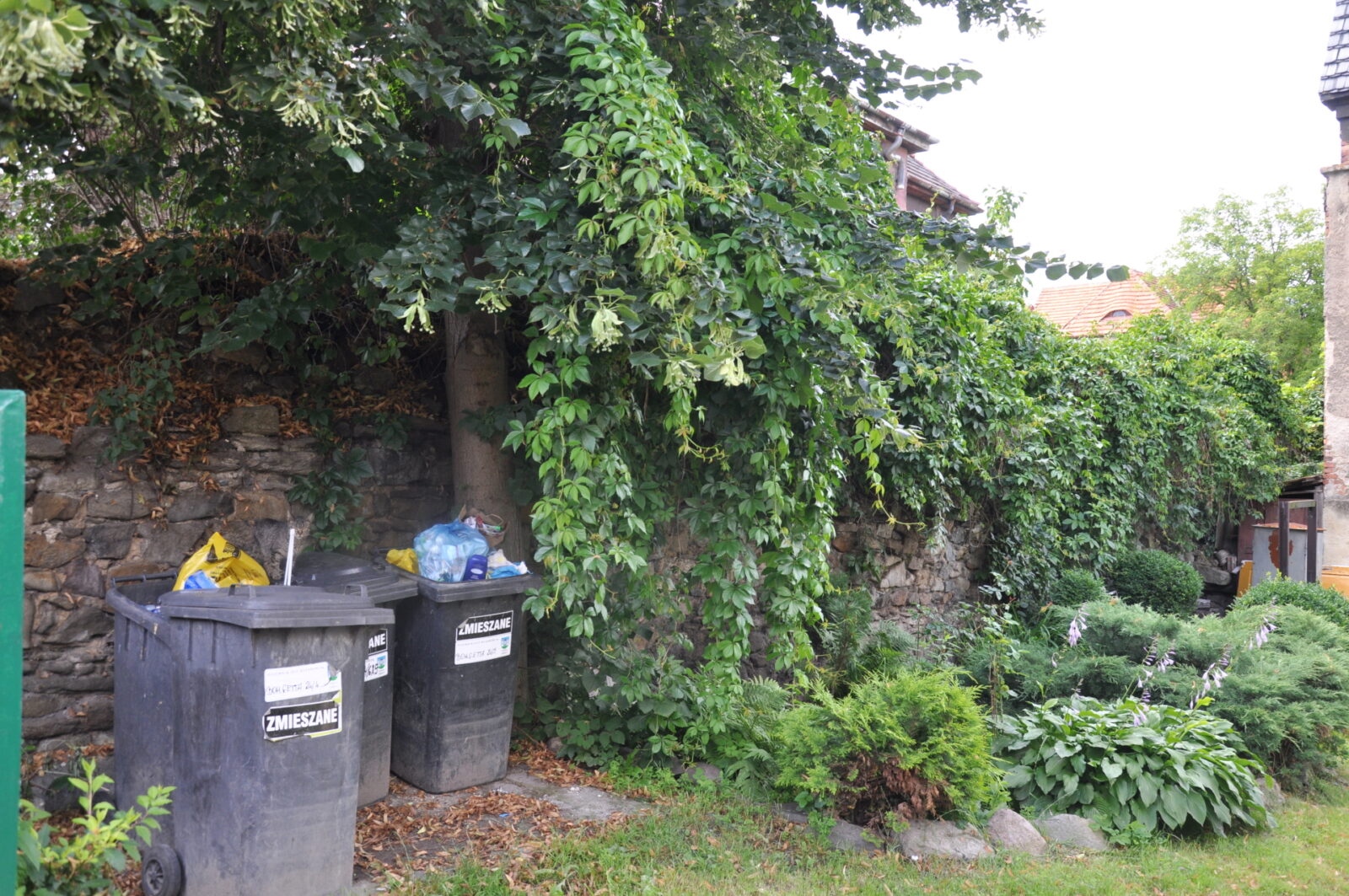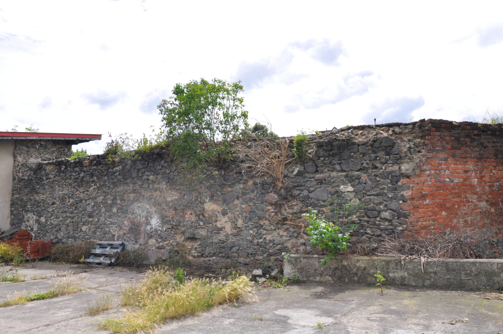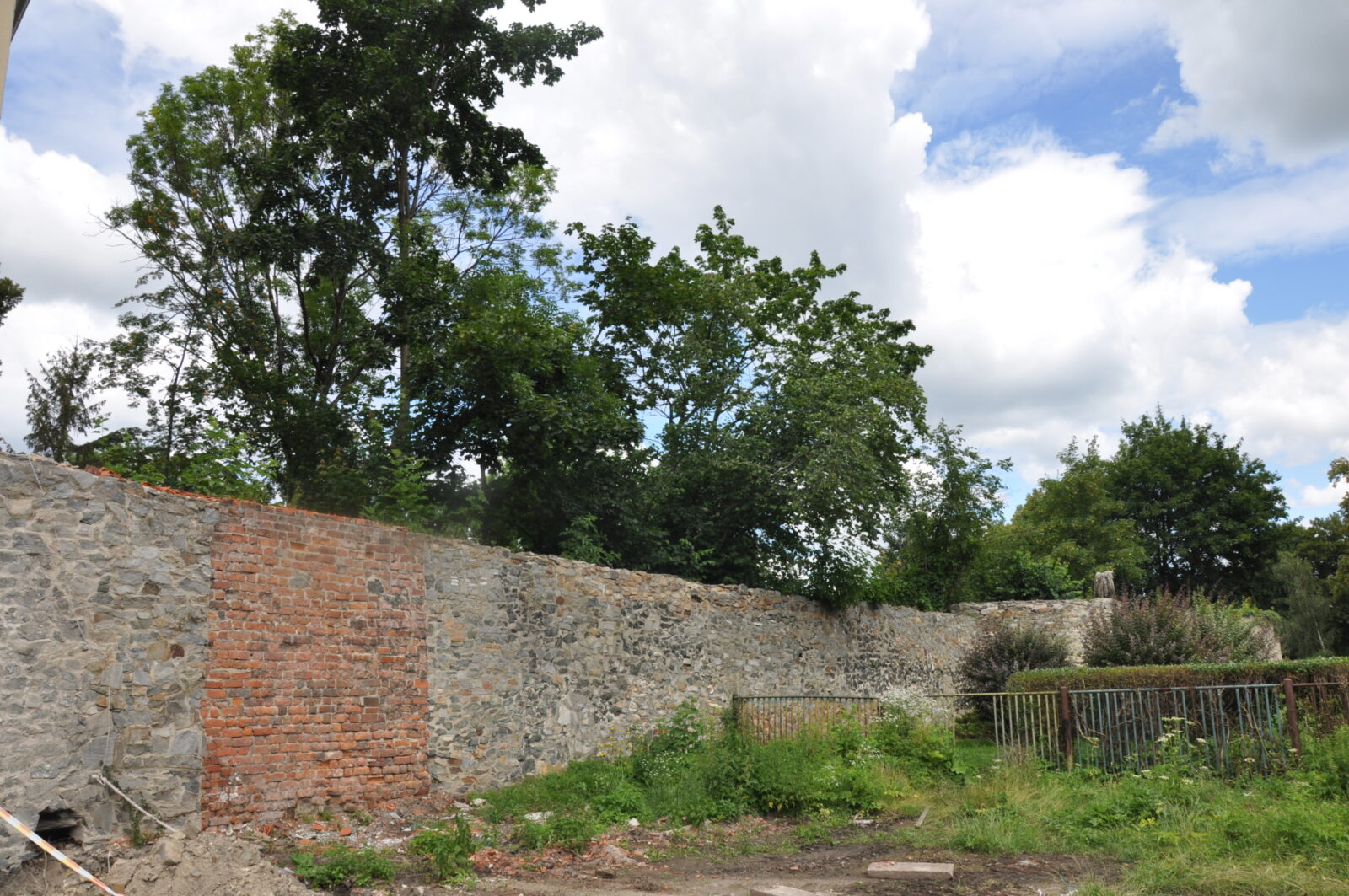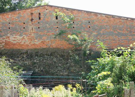 8. Odcinek muru przy wylocie ul. Bohaterów Getta - na terenie prywatnym. Fota zza ogrodzenia - jak widać pies, garaż i liście wszystko zasłaniają.