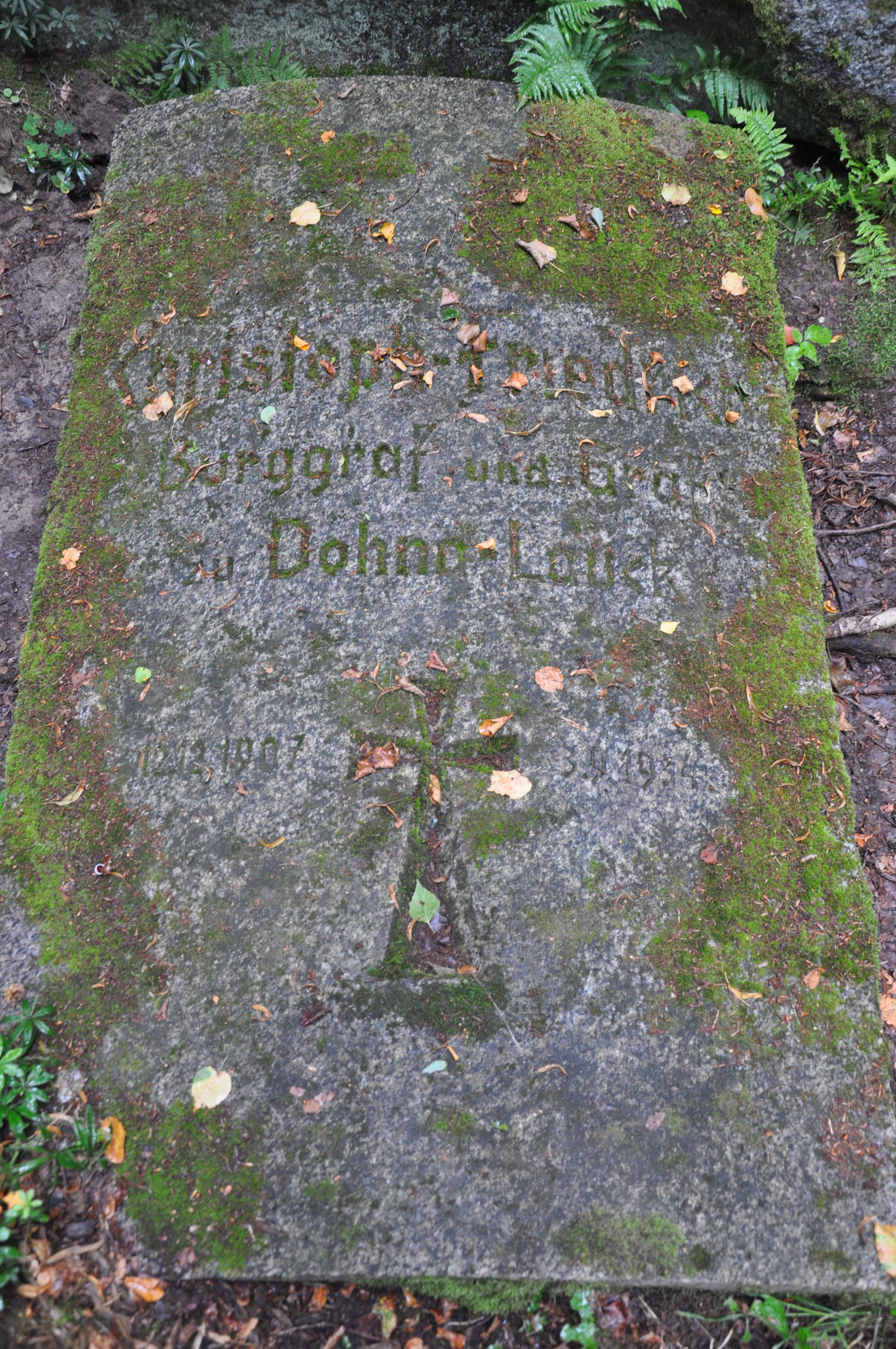 Położone jest na wzniesieniu i składa się z kamiennego półokręgu, grobowca Friedricha Ludwiga (1873–1924) i jego syna Christopha Friedricha (1907–1934) zu Dohna, kamiennych schodów i innych kamiennych elementów architektonicznych i użytkowych. Za cmentarzem, od strony południowej, znajduje się brzozowy krąg, w którego centrum, na ośmiobocznym postumencie wzniesiono drewniany krzyż (obecnie powalony).