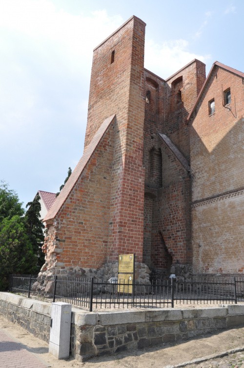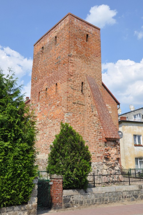 Baszta z odcinkiem muru posadowiona jest na kamiennych ławach fundamentowych. Od strony zewnętrznej kamienny cokół z obrobionych i nieobrobionych otoczaków, o zróżnicowanej wielkości, na zaprawie wapiennej, Powyżej obiekt murowany cegłą dwuręczną, gotycką o wym.: 27,5 x 9 x 13 cm w wątku wendyjskim, na zaprawie wapiennej. Miąższ muru stanowi gruz kamienny spojony zaprawą wapienną, fragmentarycznie występuje również dziewiętnastowieczna cegła maszynowa : 30 x 6,5 x 13,5 cm na zaprawie cementowej. Baszta o wysokości 8 m, założona na planie czworobocznym z odcinkiem muru po stronie północnej o wysokości 3 m, przylegającym od strony wschodniej do budynku mieszkalnego przy ul, Zabytkowej 1 z wybitym otworem drzwiowym i od strony zachodniej do budynku gospodarczego oraz krótszym odcinkiem o długości 2 m po stronie południowej . Baszta założona na planie czworobocznym, z wąskimi otworami strzelniczymi, od strony zewnętrzne j-zachodniej w dwóch poziomach ,w dolnym trzy otwory, w górnym dwa, Ponadto dwa otwory strzelnicze w ścianie południowej, na analogicznej wysokości co poprzednie. Wewnątrz szereg wnęk o zróżnicowanej wysokości i szerokości, zamknie te łukiem ostrym i odcinkowo rozmieszczone w trzech kondygnacjach.