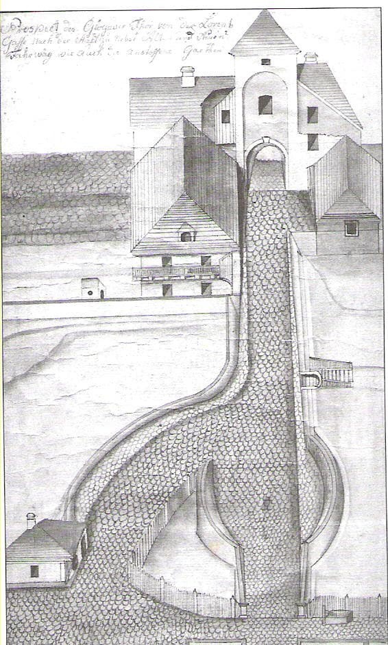 Brama Głogowska od strony miasta na rysunku A.Schucke, koniec XVIII wieku