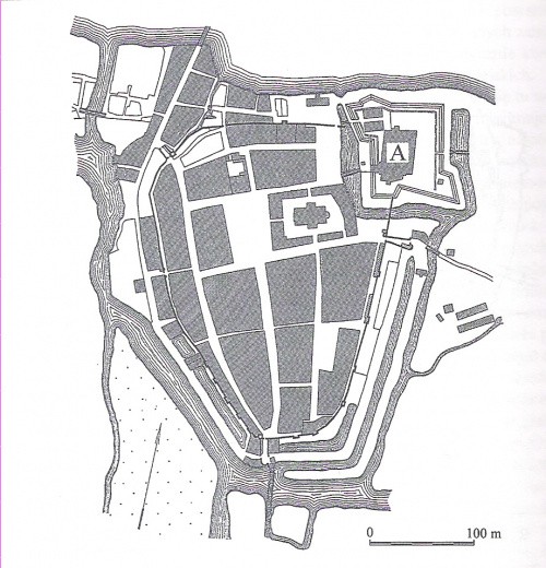 plan miasta z 1721 roku z zaznaczonym zamkiem (A)