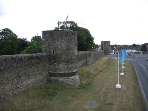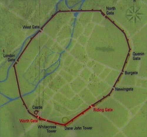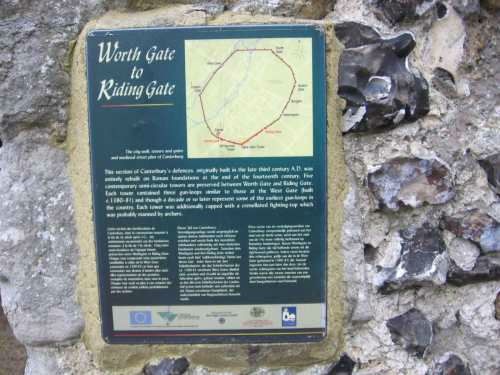Z murów otaczających dawne miasto nie pozostało wiele. To co obecnie istnieje to na planie oznaczono kolorem czerwonym. Możemy przyrównać średniowieczne Canterbury do średniowiecznego Krakowa. Całe miasto otaczały mury, w których co kilkadziesiąt metrów były wieże obronne. Wejścia strzegły obronne bramy a zamek związany był z miastem. Krakowskie baszty były ze wszystkich stron zamknięte natomiast te w Canterbury od strony wewnętrznej były otwarte. Obecnie w obu tych miastach z murów pozostały niewielkie resztki, kilka baszt i brama wjazdowa.
