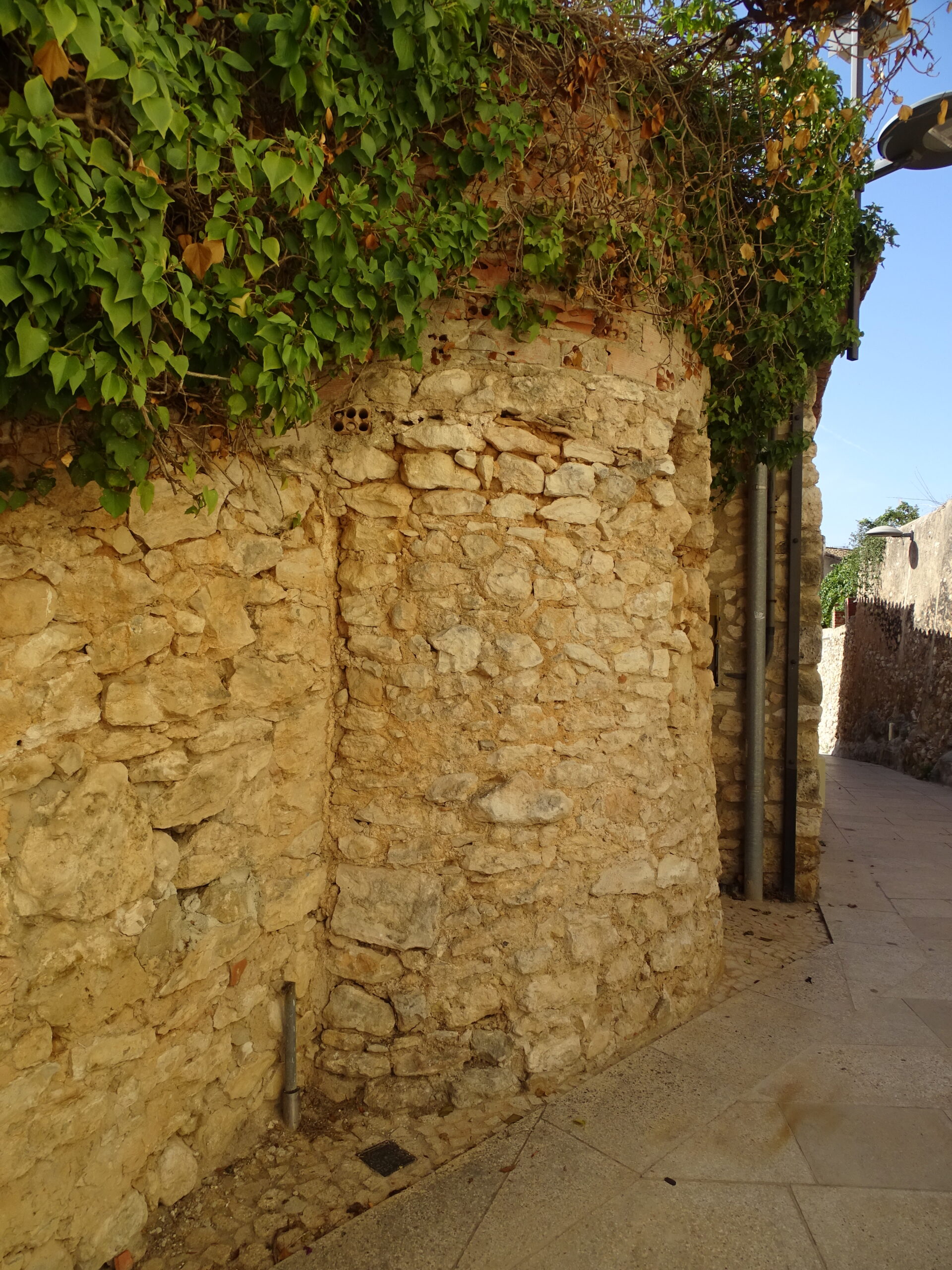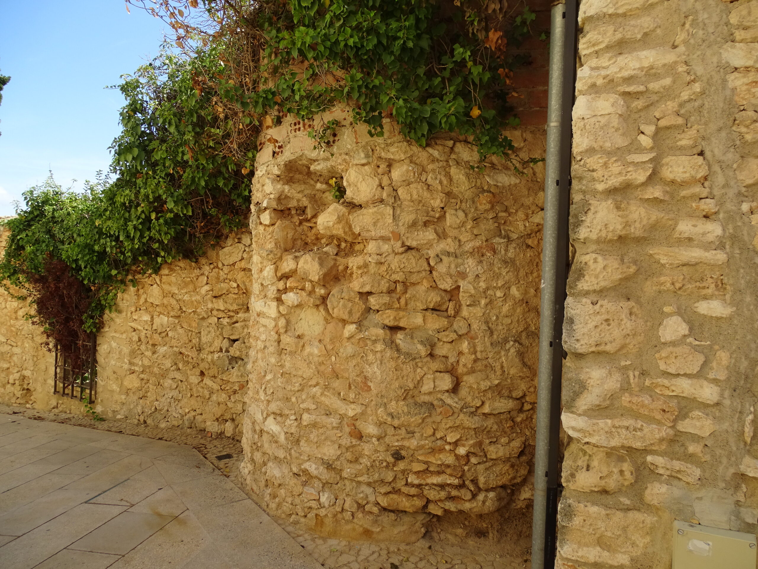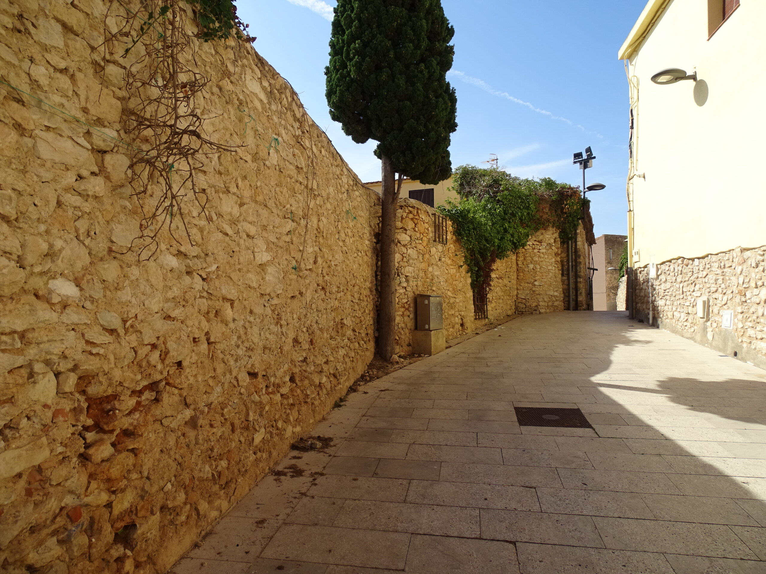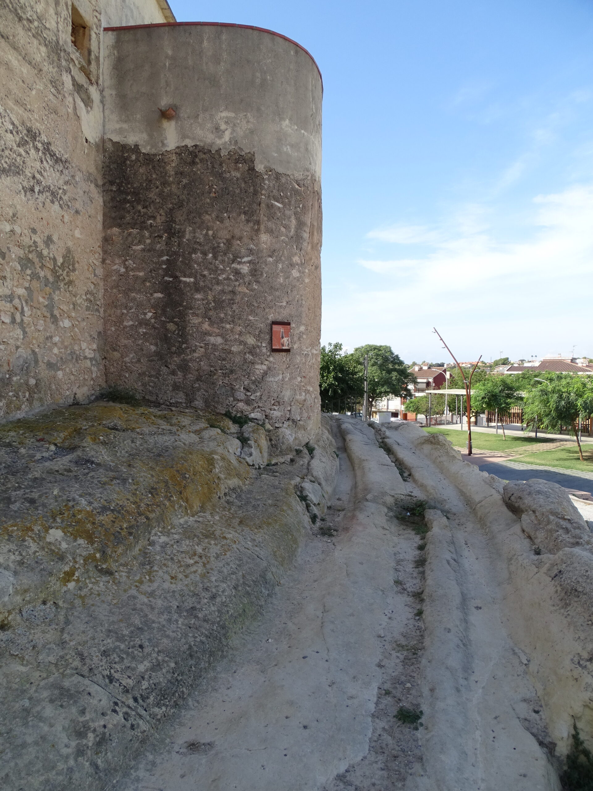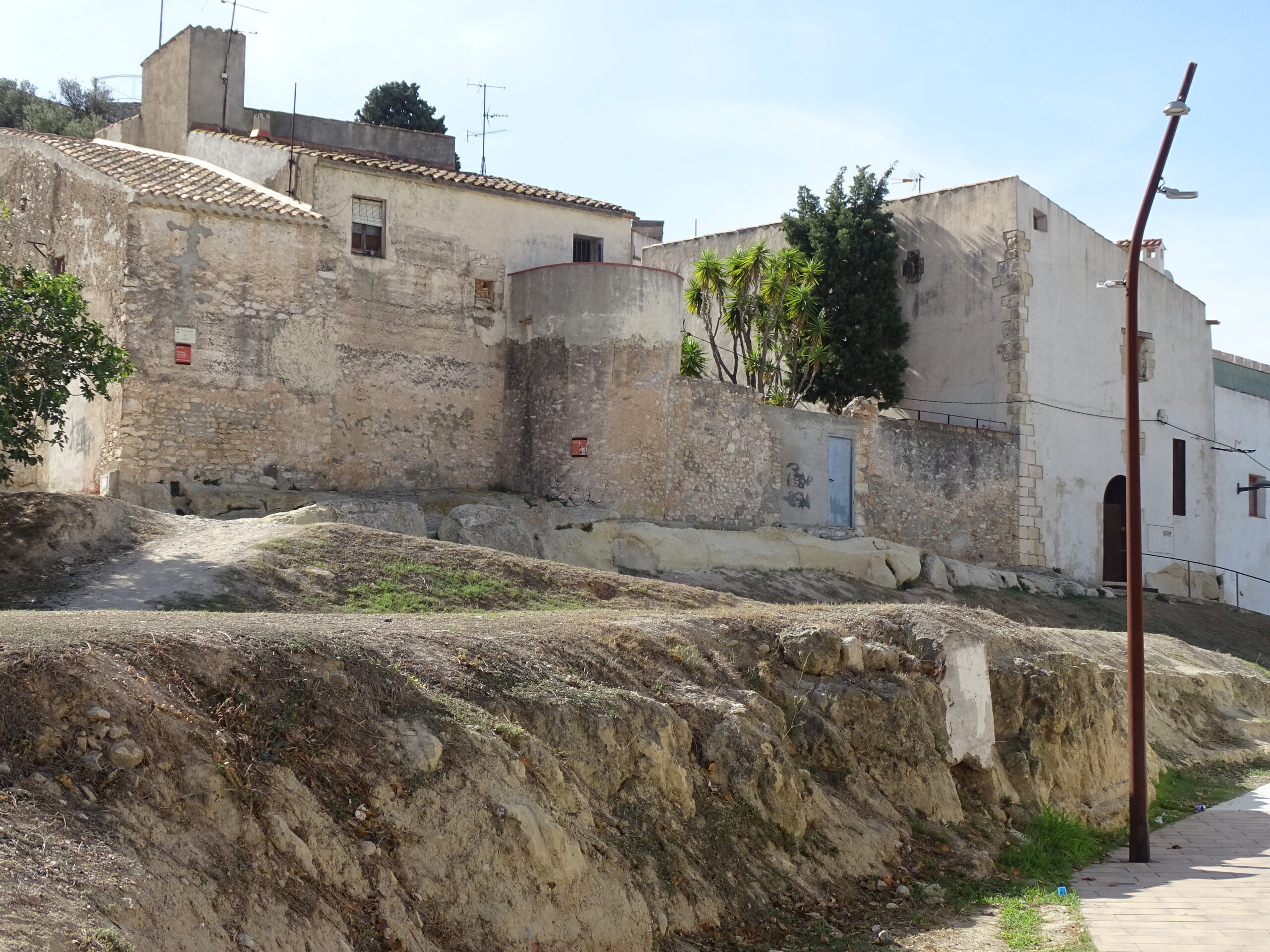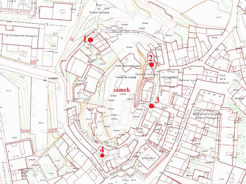 Ze średniowiecznych obwarowań Calafell z XIV w. zachowały sie tylko 3 okrągłe baszty w najbliższym sąsiedztwie zamku (zamek w Calafell opisałem tutaj ) oraz prawdopodobnie 4-ta, obudowana całkowicie domami (jej zarys jest widoczny tylko z góry).