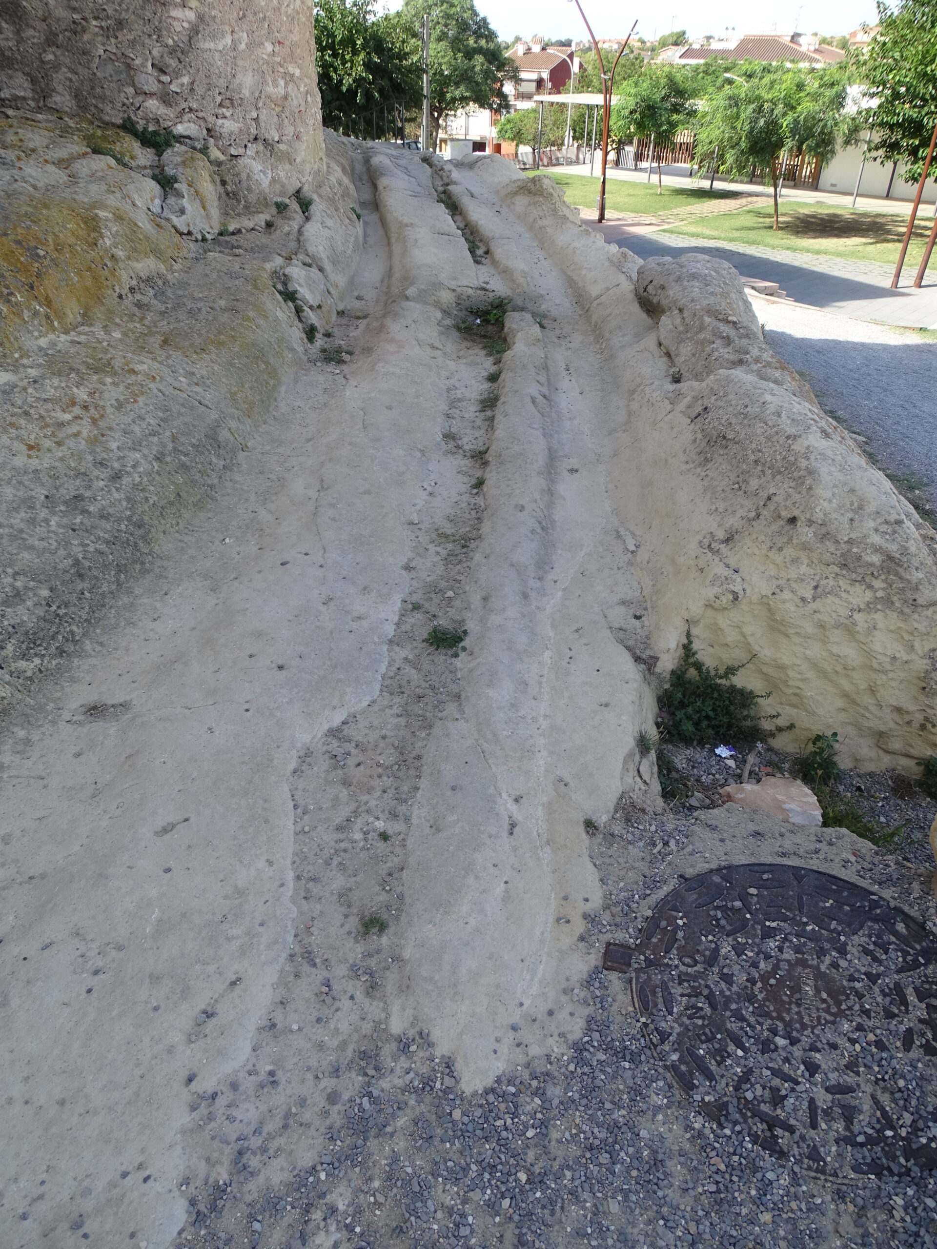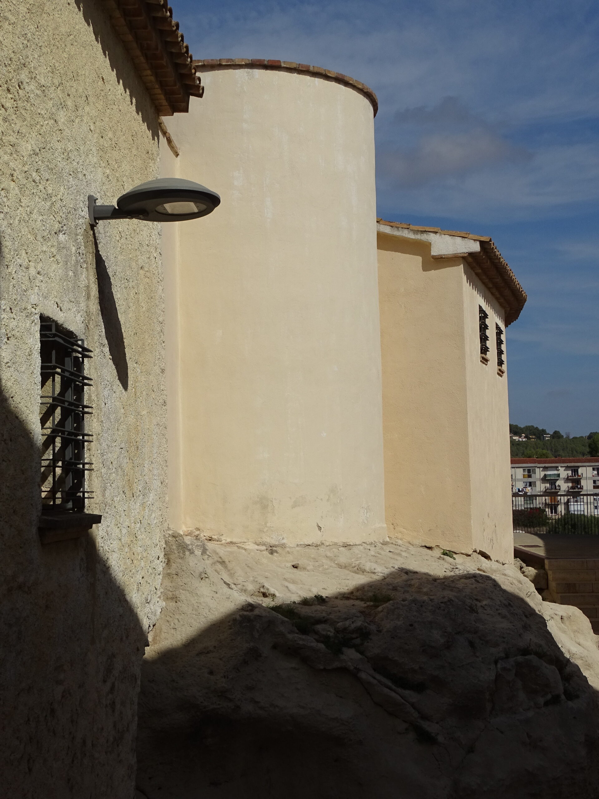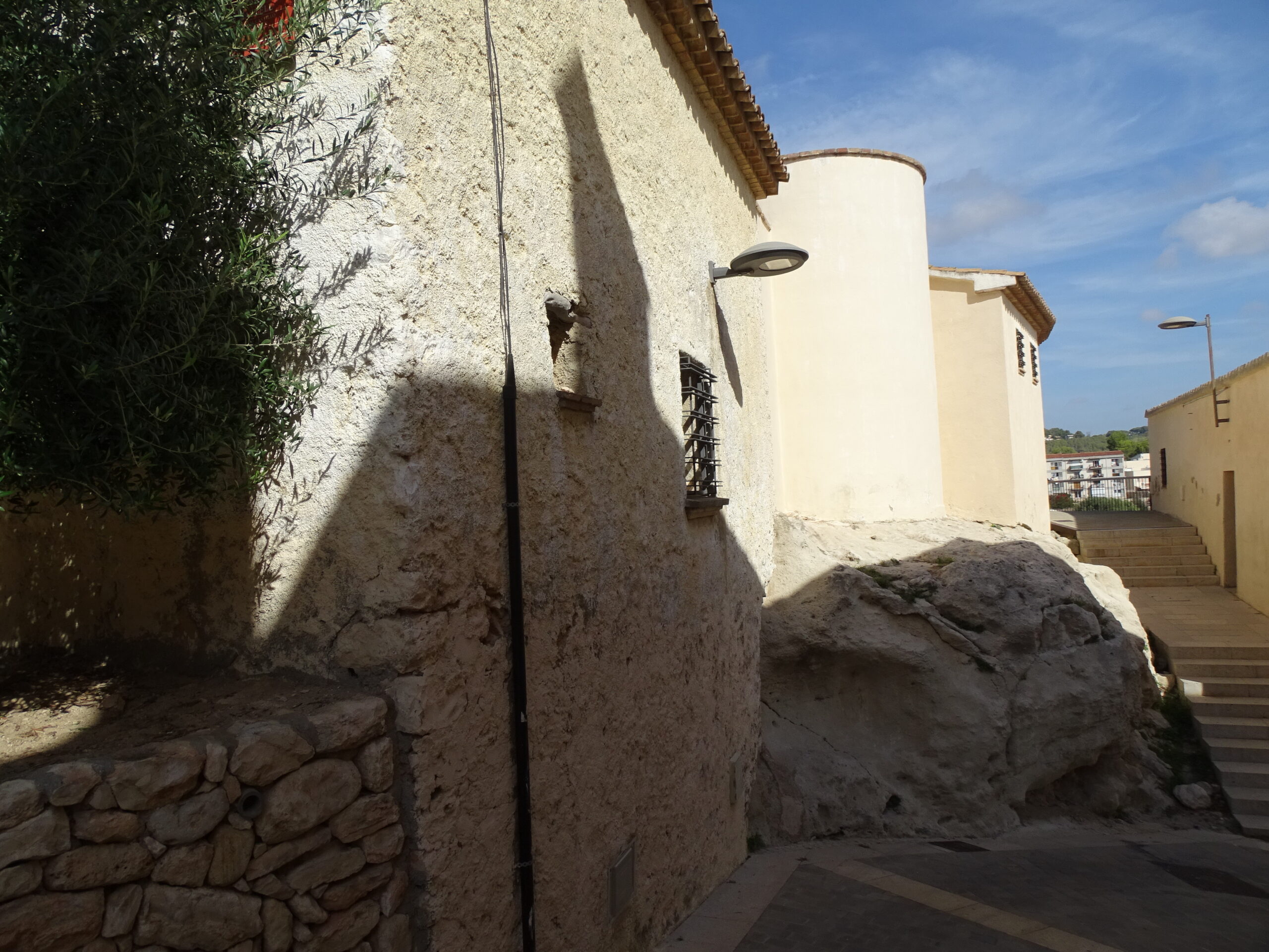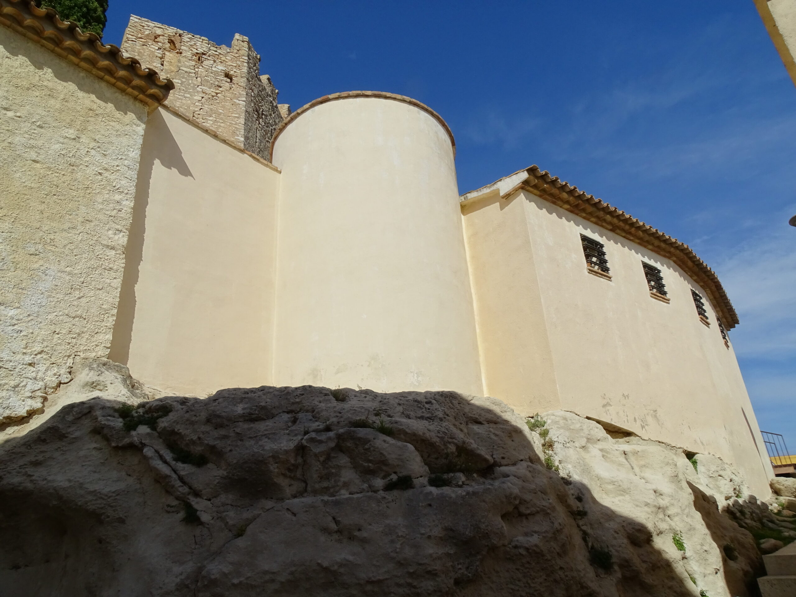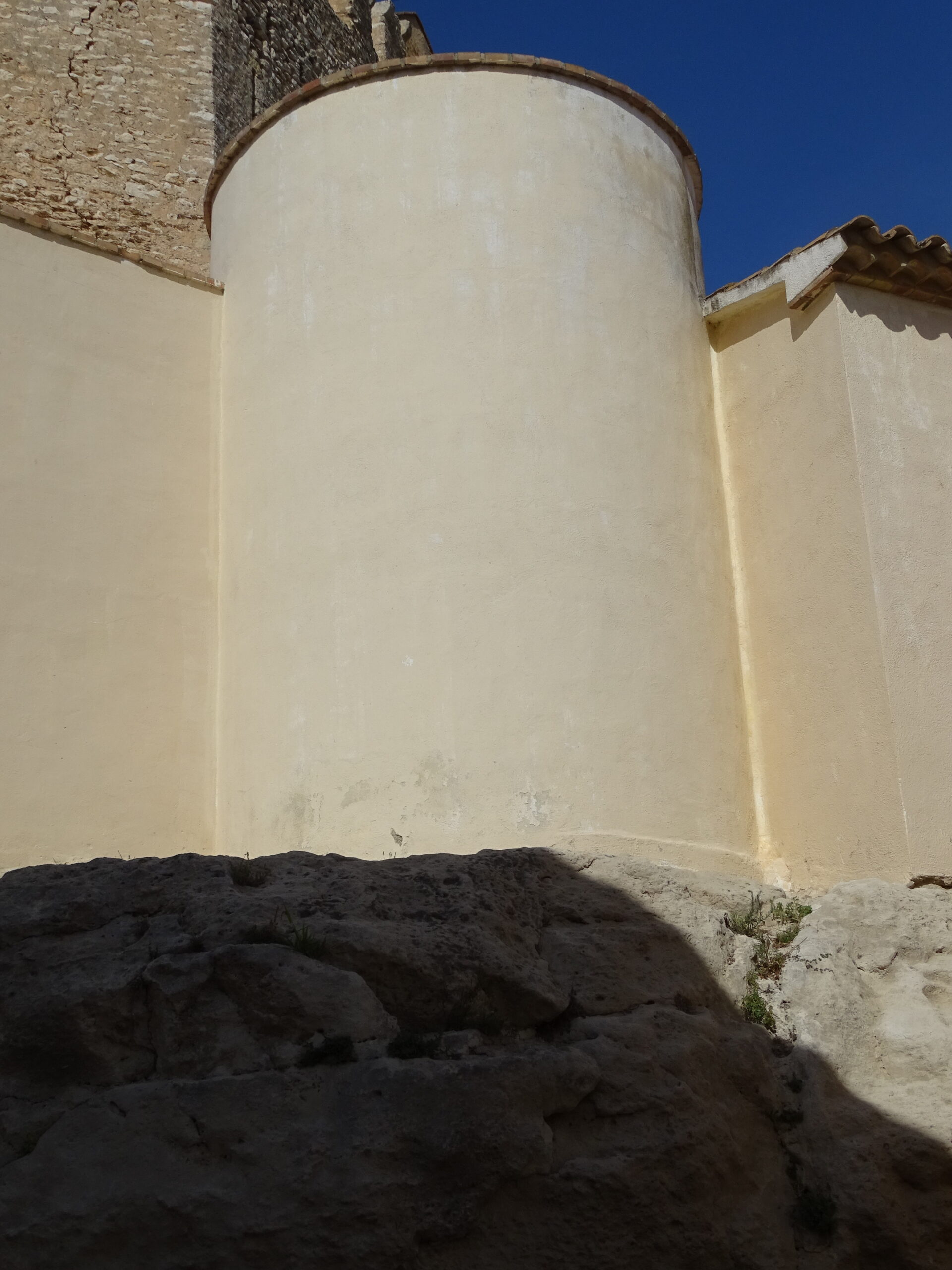 Ze średniowiecznych obwarowań Calafell z XIV w. zachowały sie tylko 3 okrągłe baszty w najbliższym sąsiedztwie zamku (zamek w Calafell opisałem tutaj ) oraz prawdopodobnie 4-ta, obudowana całkowicie domami (jej zarys jest widoczny tylko z góry).
