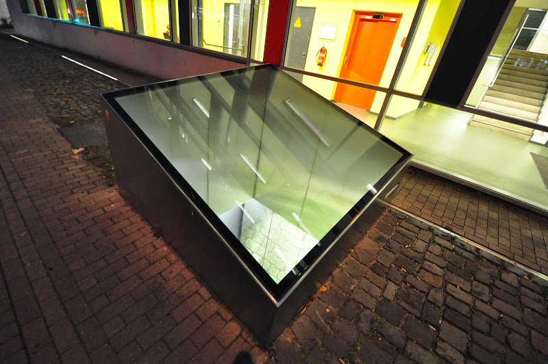 Sprytny system eksponowania archeologii in situ. W całym Akwizgranie występują tak zwane "okienka archeologiczne", do których można zajrzeć. W tym konkretnym przypadku jest kawałek muru, ale w innych miejscach są relikty rzymskie, średniowiecznej zabudowy itd. Ciekawa sprawa.