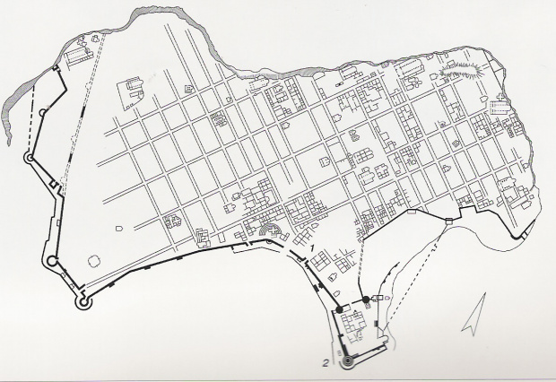 plan miasta z umocnieniami, 1-brama miejska, 2-wieża Zeno