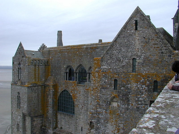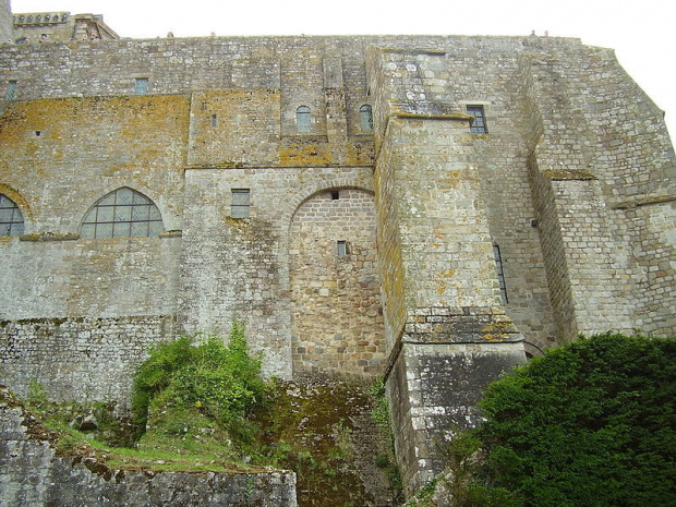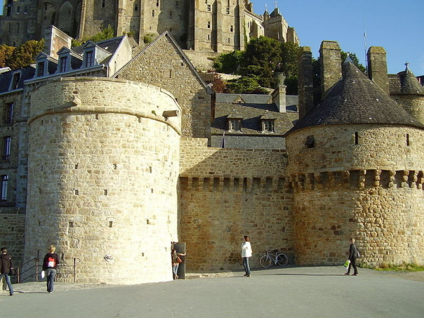 W czasie wojny stuletniej opactwo zostało opasane nowym pierścieniem murów obronnych, teraz obejmujących także miasteczko. Anglicy próbowali je kilkakrotnie zdobywać, ale bezskutecznie. Pamiątką po jednym ze szturmów są dwie machiny oblężnicze pozostawione pod murami Mont Saint-Michel.