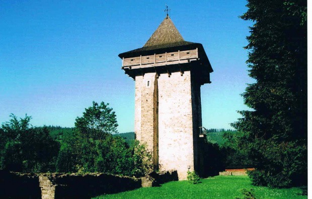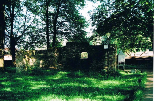 zachowana baszta i relikty drugiej