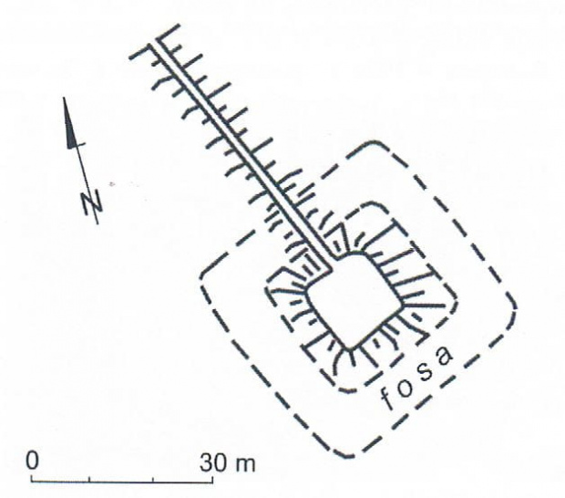 Założenie zostało wkomponowane w groblę przecinającą stawy rybne, a następnie zalane. Gródek miał formę czworobocznego wyniesienia o boku długości ok 25m dookoła, którego czytelna była fosa zachowana w formie wilgotnego obniżenia. podczas badań amatorskich prowadzonych w latach 1912, 1930 i 1937 w obrębie kopca odsłonięto fundament wykonany z dużych kamieni układanych na sucho oraz ślady przepalonych belek zalegających w kontekście spalenizny i przepalonej gliny. Przy krawędzi nasypu odkryto również skupisko kamieni układanych bez zaprawy zalegające na głębokości od 0,4 do 1,6m zinterpretowane jako rodzaj muru wzmacniającego krawędź gliniano-ziemnego kopca.