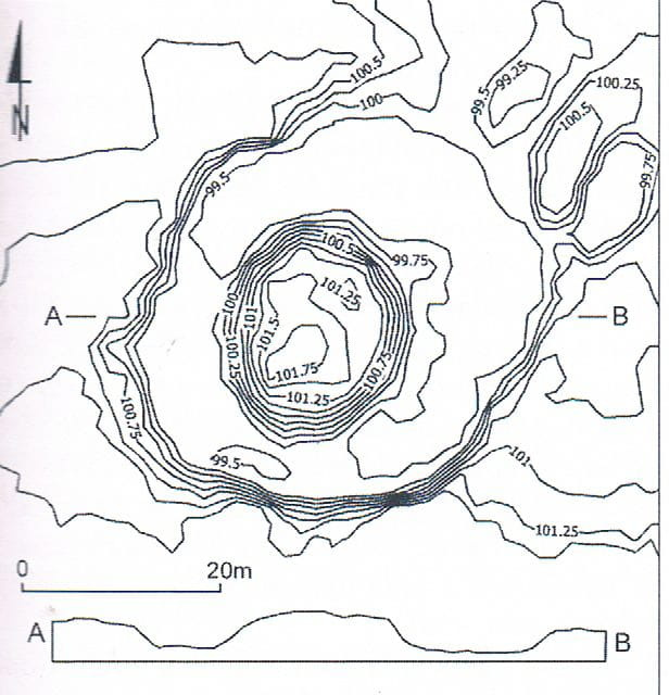 Kopiec ziemny założony na planie owalu o wymiarach u podstawy ok 19x22,5m, u góry 12,5-13,5m i wysokości 2m. Nasyp otacza fosa o szer. 6-7m, w części NE do 11m.