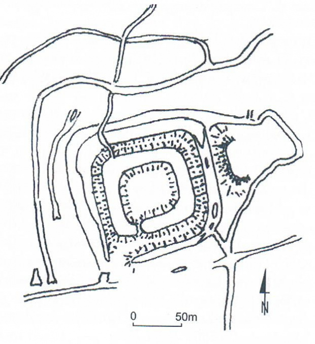 Obiekt niemal całkowicie zniszczony podczas prac związanych z regulacją Kaczawy. Na podstawie danych archiwalnych wiadomo, że było to okazałe założenie dwuczłonowe, którego głównym elementem był nasyp na planie prostokąta i wymiarach u podstawy ok 45x50m i wysokości ok. 1m. Kopiec otaczał obwód obronny składający się z podwójnego systemu fos i wałów. Fosa wewnętrzna miała szer. ok. 8m, wał ok.16-18m, fosa zewnętrzna ok. 6m. Z wykonanego w okresie międzywojennym zdjęcia lotniczego obiektu wynika, że do fosy zewnętrznej przylegał kolejny wał o znacznej szerokości rozsypiska, natomiast fosę wewnętrzną przy SW narożniku przecinała wąska ziemna grobla. Od strony E do fosy wewnętrznej przylegał drugi człon założony na planie trapezu o długości 65-70m i szer. ok. 30-60m. Podczas badań prowadzonych w 1904 roku na majdanie stwierdzono warstwę kulturową o miąższości ok 1m., w której zalegały węgle drzewne, przepalone cegły, ceramika.