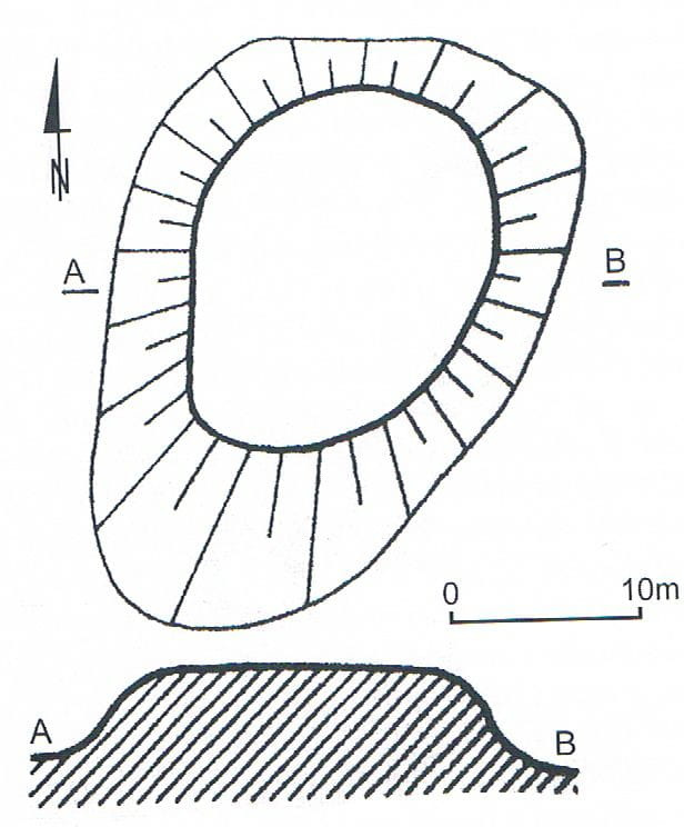 Zachowany jeszcze w latach 80-tych XX wieku nasyp zapewne już częściowo naruszony., miał wówczas plan wydłużonego owalu o wymiarach u podstawy 14x19m, u góry 12x18m i wysokości 2,5-3m. Kopiec otaczała słabo czytelna fosa. Nasyp znacznie naruszony był wkopami ziemiankowymi.