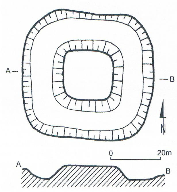Obecnie znacznie zniszczony, zachowany nasyp na planie prostokąta o wymiarach u podstawy 20x23,5m, u góry 15x17m. Kopiec jeszcze w latach 70-tych XX wieku otaczała fosa o szer. 7,5-10m, obecnie zachowana jedynie od N.