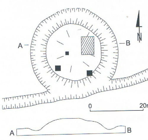 Obiekt znacznie zniszczony, zachowany w formie nasypu założonego na planie owalu o średnicy nasypu założonego na planie owalu o wymiarach u podstawy 20,5x30m, u góry 12x19,5m i wysokości do 2-2,5m w części S. Kopiec otaczała pierwotnie fosa o zachowanej szer. 4-6m i prawdopodobnie wał zewnętrzny. Majdan założenia znacznie zniszczony miedzy innymi przez wbudowaną nowożytną piwnicę.