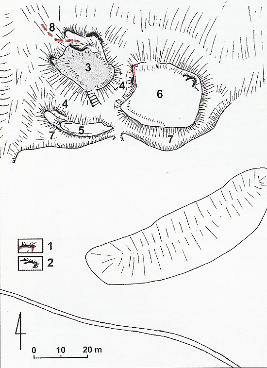 plan grodziska: 1-sztuczne ścianki skalne, 2-naturalne ściany skalne, 3-kopiec, 4-fosa wewnętrzna, 5-wał, 6-podgrodzie, 7-fosa zewnętrzna, 8-przebieg dawnej ścieżki turystycznej