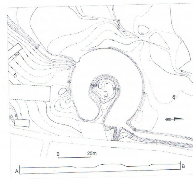 Obiekt miał formę kopca założonego na planie koła o średnicy u podstawy ok. 28m, u góry 24m i wysokości ok. 1,5m. Nasyp otaczała fosa o szer. 13-17m w części E przedzielona szeroką groblą.
