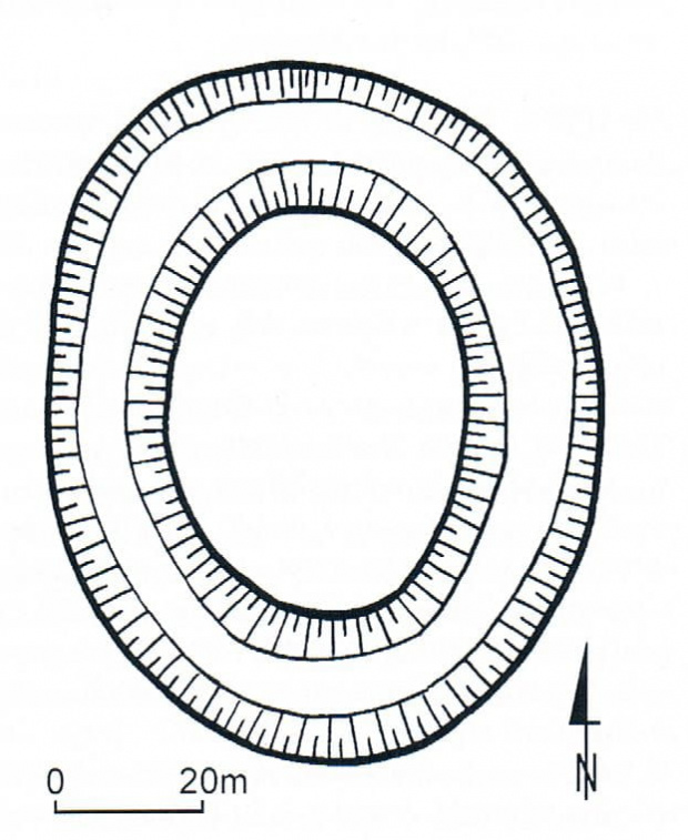 Nasyp założony na planie wydłużonego owalu o wymiarach u podstawy ok. 25x35m, u góry 20x28m i szer. 3-3,5m. Kopiec otoczony jest fosą o szer. 4m.