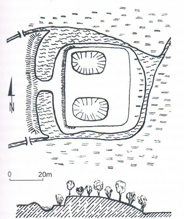 Obiekt położony wśród podmokłych łąk w sąsiedztwie strumienia w N części wsi. Kopiec założony na planie zbliżonym do prostokąta o wymiarach u podstawy 30x45m i wysokości ok. 2m. Nasyp otacza fosa o szer. 4-5m zachowana w częsci Wi N oraz widoczny częściowo wał zewnętrzny o wys. 0,5m. Obiekt już w okresie międzywojennym był znacznie zniszczony rabunkowymi wkopami. w których profili pozyskano materiały ruchome. Na W i S stokach widoczne był ślady suchego muru granitowego, pierwotnie otaczającego zapewne cały majdan.