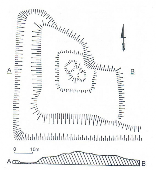 Grodzisko „Kellerberg" z ruinami piwnicy być może po dawnym dworze myśliwskim książąt brzeskich.
