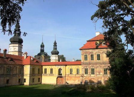 Pierwotnie wieś stanowiła własność księstwa opolskiego, po 1280 najpierw w dobrach kościelnych klasztoru w Jemielnicy, od 1447 roku siedziba rodziny von Zyrowskich. W 1631 kupiony przez barona, później hrabia Melchiora Ferdynanda von Gaschina, który rozbudował renesansowy dwór na pałac w formie rezydencji barokowej. Pałac jest cztero-skrzydłowym, z dziedzińcem wewnętrznym na prawie kwadratowym planie, we wschodniej części skrzydło wschodnie na planie litery L, z dziedzińcem gospodarczym. Przebudowa w 1781 roku, odtworzenie wyposażenia 1899, głównie sanacja i restauracja w roku 1904-11 i 1959-60. Trój-kondygnacyjne skrzydło główne (północne), z wysokim, mansardowym dachem 4-spadowym. Reprezentacyjne, 2-kondygnacyjne skrzydło południowe, kondygnacja górna ze ślepymi arkadami zamkniętymi łukiem koszowym, symetrycznie podzielona przez usytuowanie wieży pośrodku i (wyższych) na narożnikach, te ostatnie z wysokimi barokowymi hełmami. Neobarokowe wyposażenie, ogólnie dobry stan zachowania pałacu. Od południowo- zachodniej strony pałac graniczy z kościołem. Otoczony murami, z wieżą wejściową. Po II wojnie światowej mieściło się w nim sanatorium dla dzieci. Obecnie jest własnością prywatną.