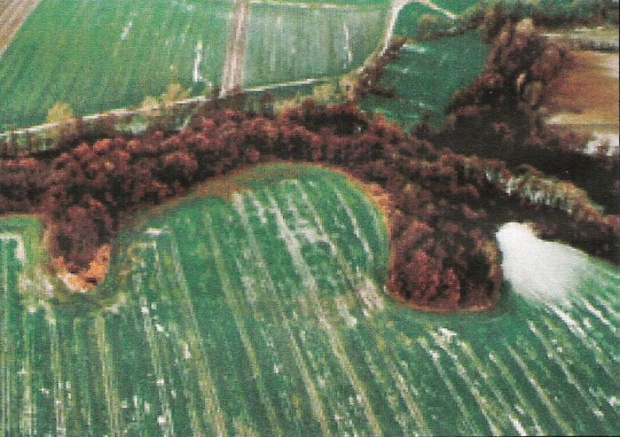 Widok grodziska wczesnobrązowego w Jędrychowicach z lotu ptaka, od strony wschodniej (źródło W. Gogolewski, E. Tomczak, Grodziska Górnego Śląska i Zagłębia Dąbrowskiego z lotu ptaka, Katowice 1996