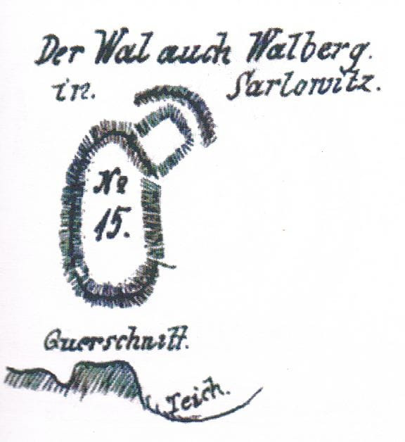 Obecnie znacznie zniszczony, zachowana W część nasypu o wymiarach 28x36m ograniczona od W rowem o szer. 7-8m. Jeszcze w XIX wieku założenie miało się składać z dwóch części. Większy nasyp miał wówczas wymiary 14x48m, mniejszy 7x15m. Mniejszy kopiec był pierwotnie wyższy jednak został zniwelowany, a pozyskaną z niego ziemią zasypano rów dzielący oba człony. od strony NE do nasypu przylegał staw.