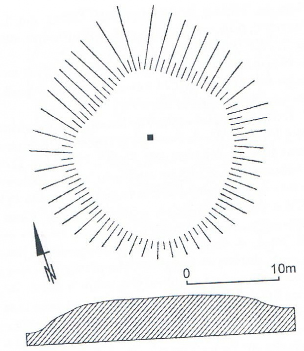 Nasyp założony na planie czworoboku z zaokrąglonymi narożami o wymiarach u podstawy 24x26m, u góry 13,5x15m wysokości do 2m. Obiekt pierwotnie otaczała słabo widoczna obecnie w terenie fosa.