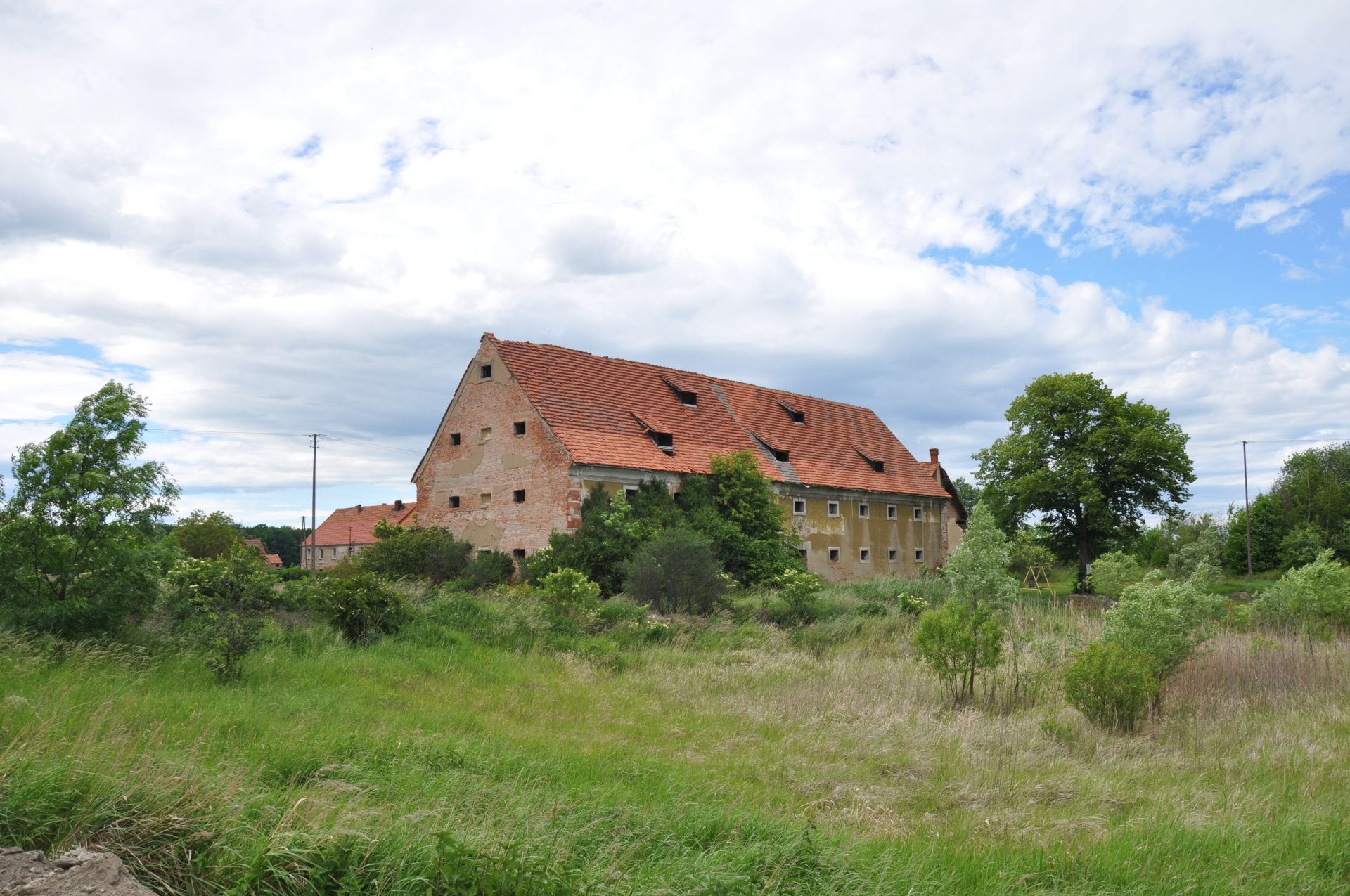 Nie ma grodziska, nie ma już nawet sadzawki/fosy. Jeszcze tylko spichlerz jakoś się trzyma.