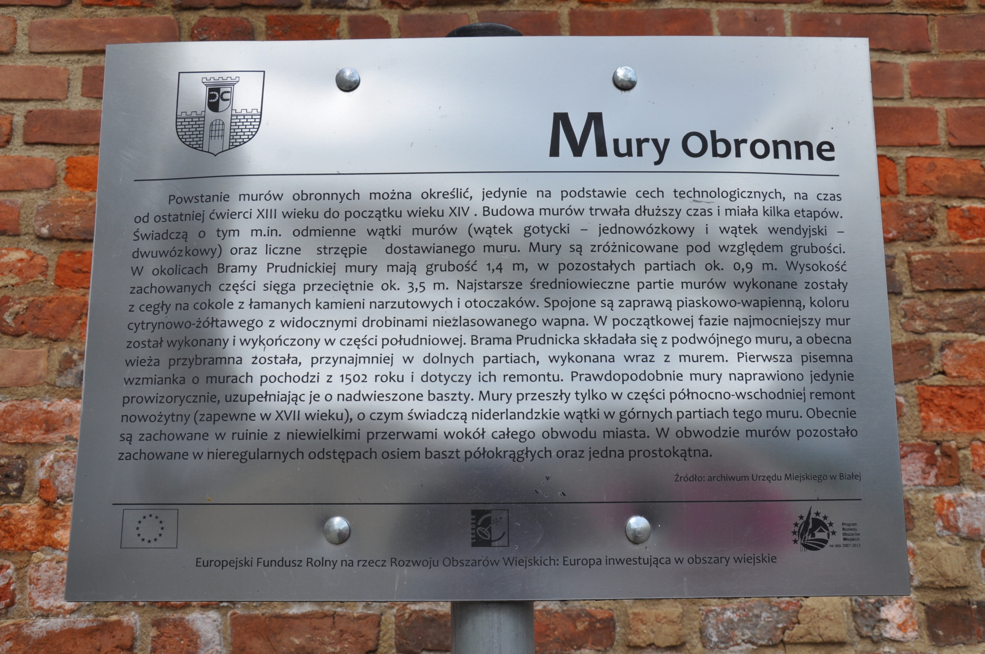 Prawa miejskie Biała otrzymała w 1372 roku z rąk Henryka Niemodlińskiego na prawie wrocławskie czyli magdeburskim. Mury miejskie w Białej powstały zapewne na początku XV wieku. Górną granicę ich powstania wyznacza dokument z 1502 r. księcia Jana wymieniający mury, które są już wówczas w bardzo złym stanie. Specjalna dotacja na ich reperację łączy się zapewne z ogólną akcją podjętą przez księcia Jana zdążającą do zabezpieczenia się przed najazdami tureckimi. W obwodzie murów zachowało się osiem baszt półokrągłych oraz jedna prostokątna. Prócz tego można odczytać ślady, w formie fragmentu muru, po dawnej bramie Nyskiej przy ul. Góra Wolności, w pobliżu założenia zamkowego (dawnych stajni). Mury były wzmocnione przez wały i fosy, po których zachowały się ślady w formie wzniesień i zagłębień terenu od strony południowej przy ul. Władysława Reymonta, oraz na tyłach murów zachowanych przy ulicy Wałowej, której nazwa potwierdza istnienie umocnień ziemnych wokół miasta. Wałów takich nie było po stronie zachodniej i południowej miasta, gdzie ukształtowanie terenu nie wymagało takich umocnień. Mury wzniesiono z cegły o wymiarach 27 × 9 × 14 z użyciem kamienia. Do podmurówki użyto otoczaków, którymi także wypełniono wnętrze zasadniczego muru. Grubość muru wynosi 1,20m, a wysokość zachowanych partii sięga przeciętnie około 3,5m. Kurtynę prostych murów przerywają półcylindryczne baszty rozmieszczone obecnie nieregularnie. Odległości między basztami wynoszą przeciętnie około 50m. W odcinku od ul. Szkolnej po południowo -zachodniej stronie miasta, zachowały się trzy baszty z których jedna w części przykościelnej posiada kształt prostokąta otwartego w kierunku wnętrza miasta. Półcylindryczna, środkowa baszta tegoż odcinka posiada drewniany daszek wsparty na drewnianych słupach oraz schody umieszczone przy murze po jego zewnętrznej stronie. Schody prowadzą na górne pomieszczenie wzniesione ponad murem baszty. W odcinku przy plebani i starym cmentarzu zachowały się dwie baszty półcylindryczne. Istniejąca między nimi kurtyna muru wzmocniona jest na pewnym odcinku dwoma szkarpami. Dalej w kierunku północnym, w pobliżu dawnej bramy Nyskiej zachowała się pojedyncza baszta o niskiej już bardzo koronie murów. Mury na tyłach obecnej ul. Wałowej stanowią dość jednolity ciąg. Kurtynę murów przerywają tam trzy półokrągłe baszty, z których ostatnia, południowa jest znacznej wysokości w porównaniu z pozostałymi. W obwodzie murów zachowało się osiem baszt półokrągłych oraz jedna prostokątna. Prócz tego można odczytać ślady, w formie fragmentu muru, po dawnej bramie Nyskiej przy ul. Góra Wolności, w pobliżu założenia zamkowego (dawnych stajni). Mury były wzmocnione przez wały i fosy, po których zachowały się ślady w formie wzniesień i zagłębień terenu od strony południowej przy ul. Władysława Reymonta, oraz na tyłach murów zachowanych przy ulicy Wałowej, której nazwa potwierdza istnienie umocnień ziemnych wokół miasta. Wałów takich nie było po stronie zachodniej i południowej miasta, gdzie ukształtowanie terenu nie wymagało takich umocnień.