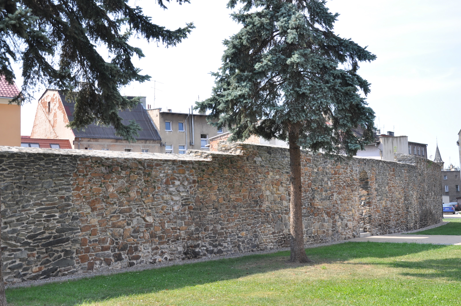 Mury obronne wraz z wieżą i bramami górną i dolną wybudowano w 1350 roku na polecenie biskupa Przecława z Pogorzeli. Pierwotnie miały 5 m. wysokości i 2 m. grubości. Umocnienia rozebrano ok. 1860 roku. Do dziś zachowały się tylko fragmenty murów np. przy ulicy Curie-Skłodowskiej oraz wieża Bramy Górnej.