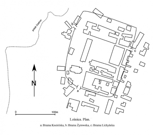 Najstarszą informacją o miejscowości jest akt nadania przez księcia opolskiego Kazimierza I (1211 1230) prawa dla gości w Leśnicy na wzór Opola i Raciborza, pochodzący z 1217 r.. Jej właścicielem był wówczas kanonik wrocławski Sebastian. Warto zwrócić uwagę, że aż do 1386 r. brak w źródłach bezpośrednich informacji o funkcjonowaniu prawa niemieckiego. W 1451 r. Leśnicę strawił pożar. Dziewięć lat później Jerzy z Podiebradów przekazał miasto księciu opolskiemu Mikołajowi (1460 1476). Decyzja ta była sprzeczna z interesami Janusza IV oświęcimskiego, który najechał i zajął Leśnicę 16 sierpnia 1460 r.. Dopiero 19 października tego roku ustąpił on w zamian za wypłatę odszkodowania wysokości 1700 guldenów. Leśnica była w średniowieczu miastem niewielkim. Zdaniem H. Głowackiego, u progu XV w. mogło ją zamieszkiwać około 300 mieszkańców, co wydaje się prawdopodobne przy niespełna 50 rekonstruowanych działkach miejskich. Obwód miasta wynosił około 830 m, zamykających powierzchnię w przybliżeniu 4,4 ha. Leśnica prawdopodobnie posiadała w średniowieczu jakieś umocnienia murowane. O ich istnieniu dowiadujemy się z dokumentu będącego świadectwem ich zniszczenia. Nie sposób jednak określić, jak wyglądały i kiedy zostały wzniesione. Na podstawie nikłych źródeł można ocenić, że przynajmniej w południowej części miasta funkcjonował miejski mur. Brak bezpośrednich przesłanek by odnieść XVIII w. informacje o trzech bramach (w tym prowadzących do dwóch podmiejskich wsi) do wieków średnich. Być może były to bramy nowożytne o lokalnym znaczeniu lub wręcz rogatki. Do naszych czasów nie przetrwały żadne materialne pozostałości leśnickich umocnień.