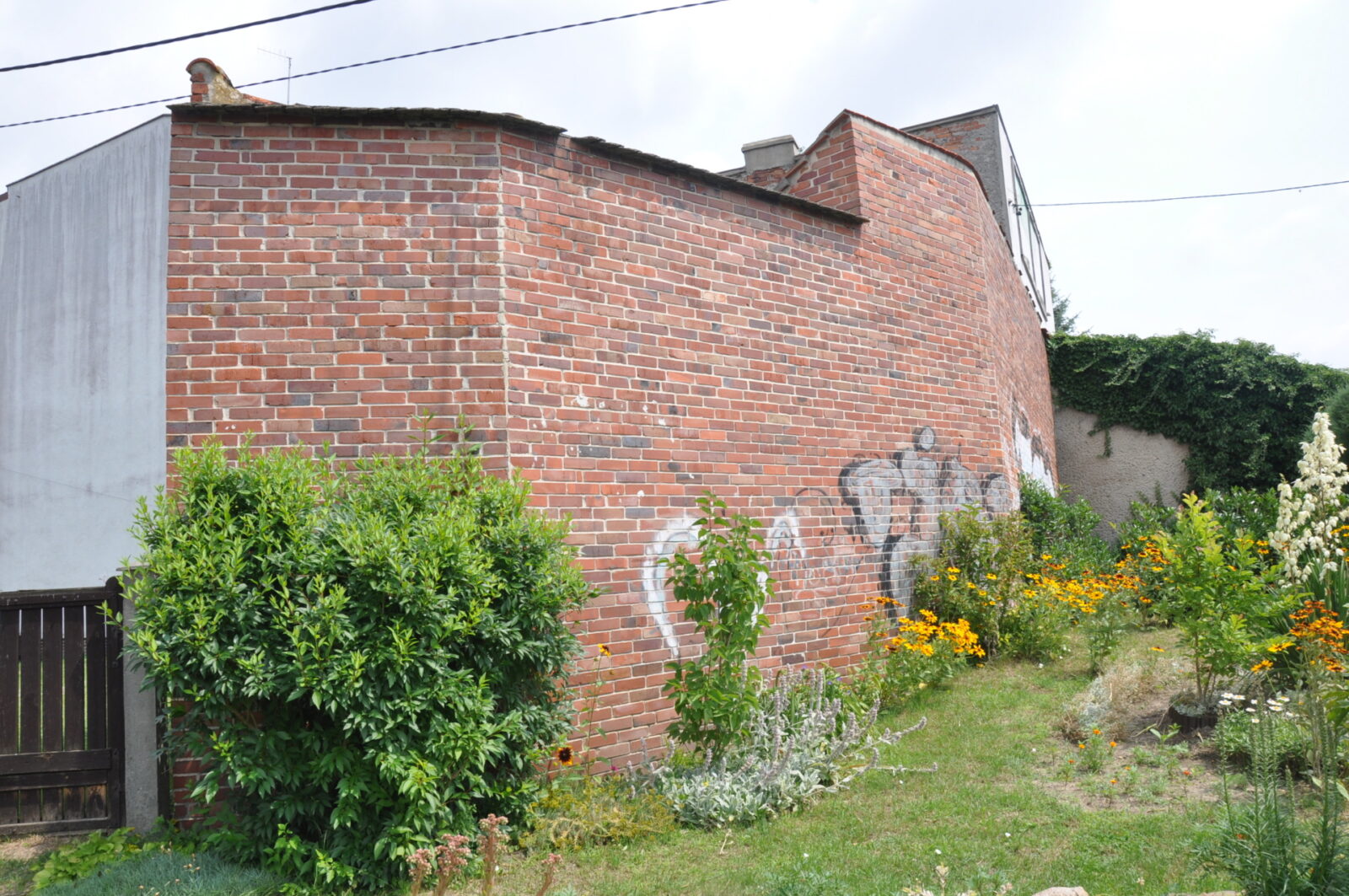 nikłe relikty na podwórku za kamienicą z murkiem