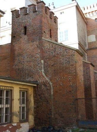 Co do pozostałych fragmentów. Baszta Wilk znajduje się na podwórzu niedostępnego dla turysty klasztoru, więc z zapoznaniem się z nią jest problem. Na szczęście pomiędzy bramą wjazdową na podwórze a chodnikiem jest spora szpara i w ten sposób można przyjrzeć się baszcie „od tyłu”, stoi ona bowiem na wprost bramy. Ogrodzenie po jej lewej stronie też nie jest zbyt wysokie, więc jeśli ktoś jest wysoki, albo ma stołek lub drabinkę to może postarać się wejść na mur odgradzający teren klasztorny i wtedy basztę widać całkiem ładnie z boku. Ostatnia baszta kryje się w murach kaplicy św. Wojciecha i przylega do niej mały fragment zrekonstruowanego muru.