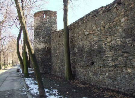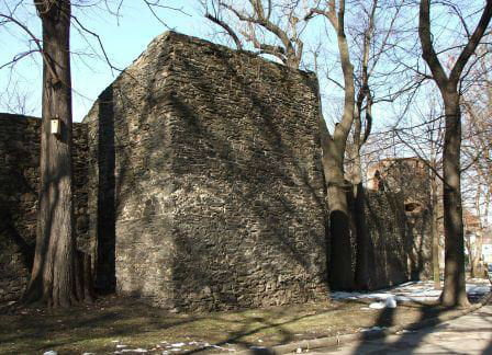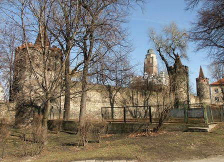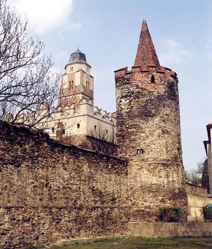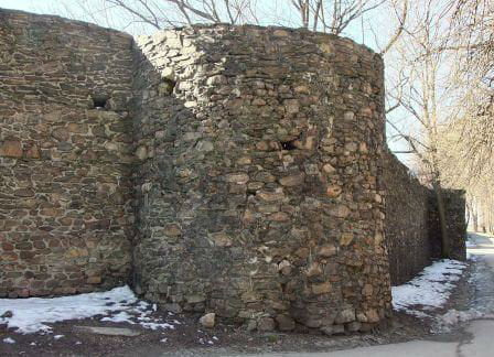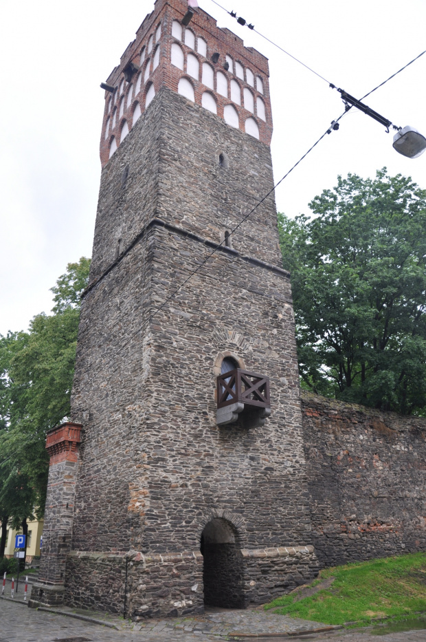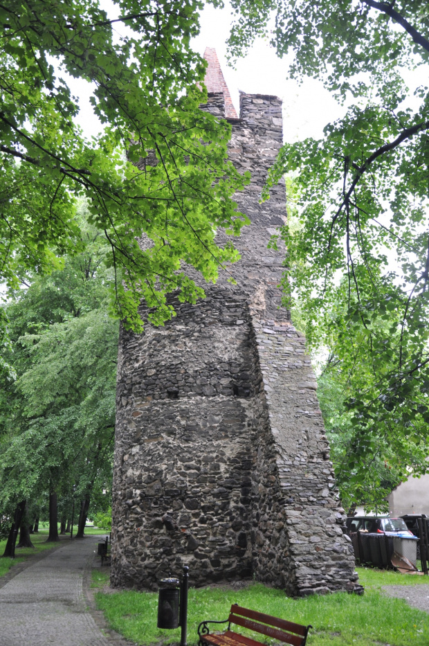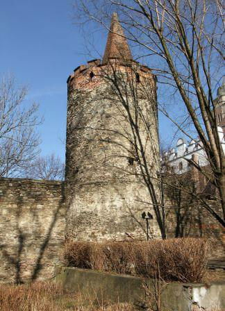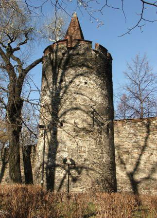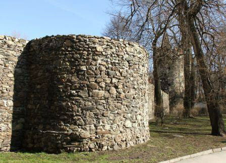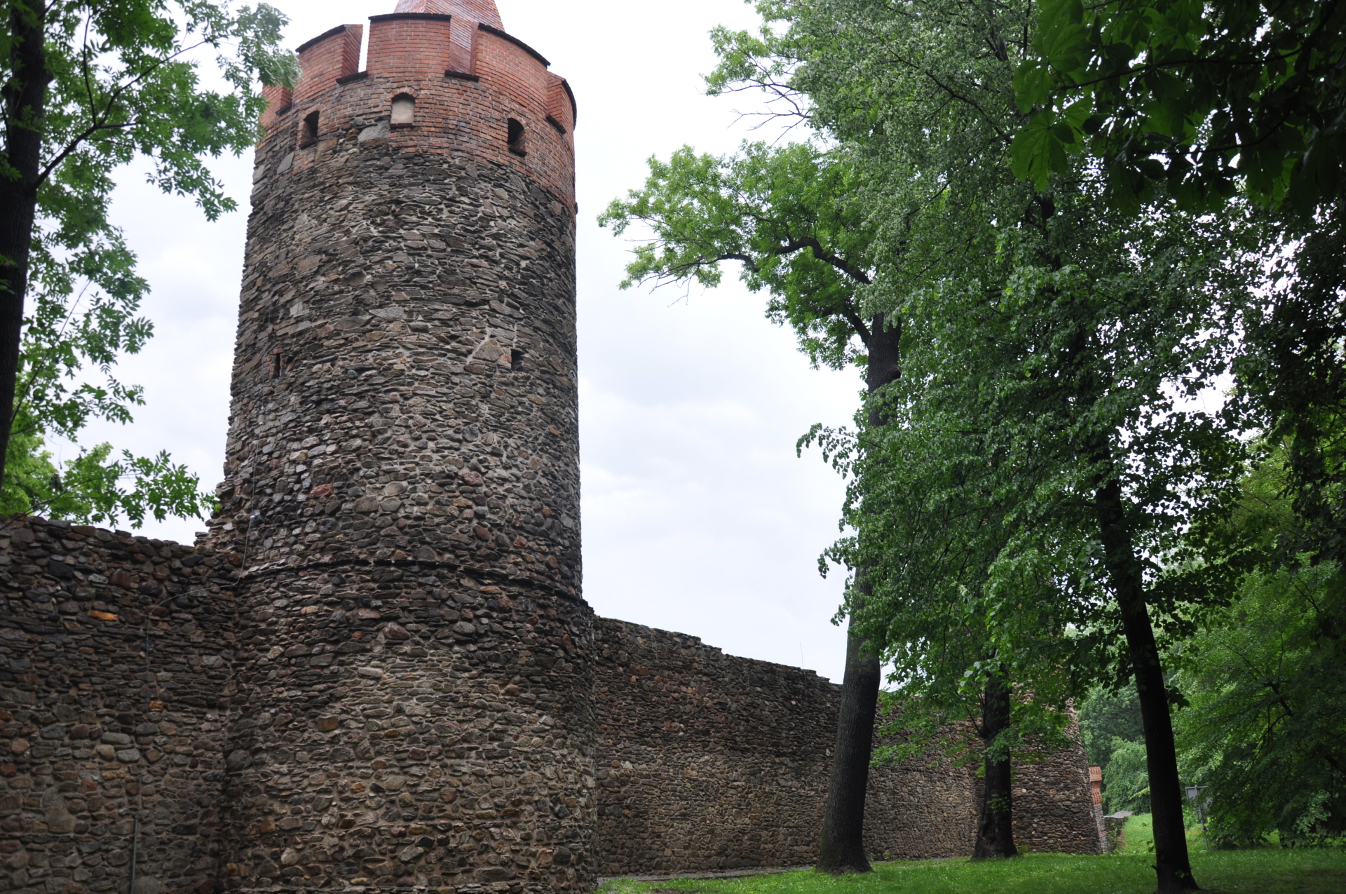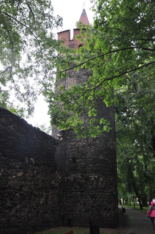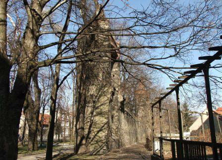 Fragment murów miejskich z basztą. W głębi - warowny kościół parafialny