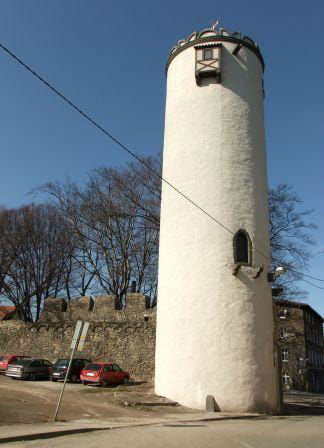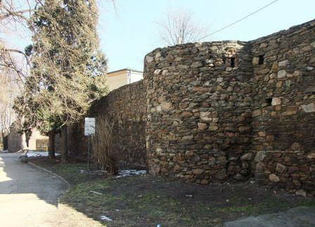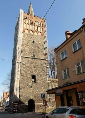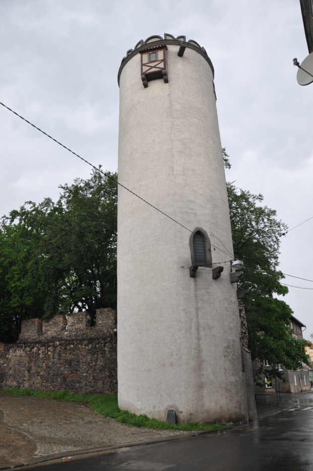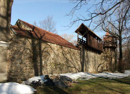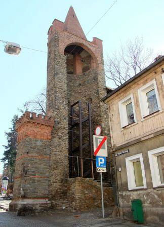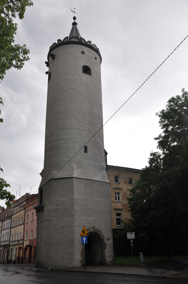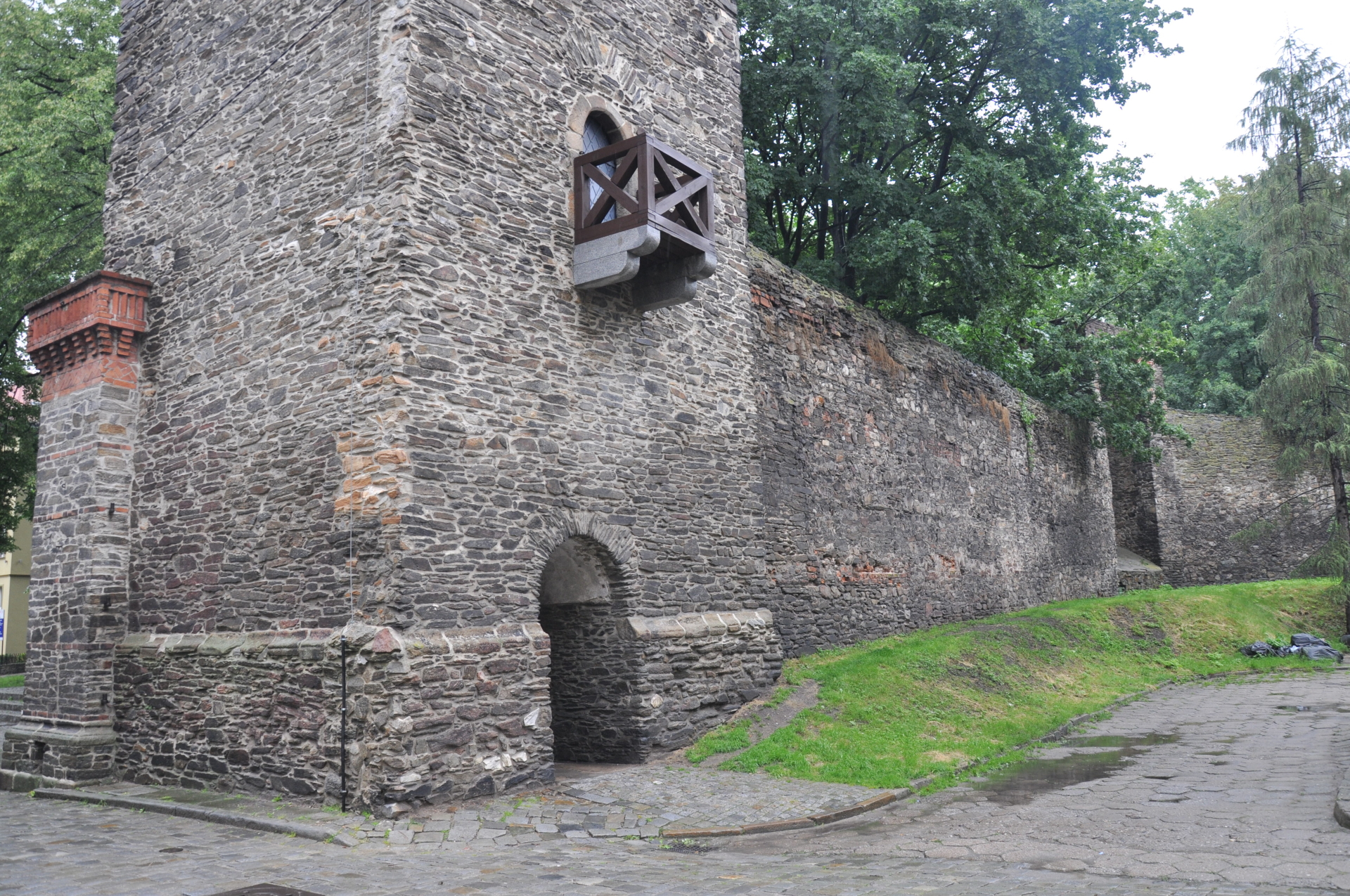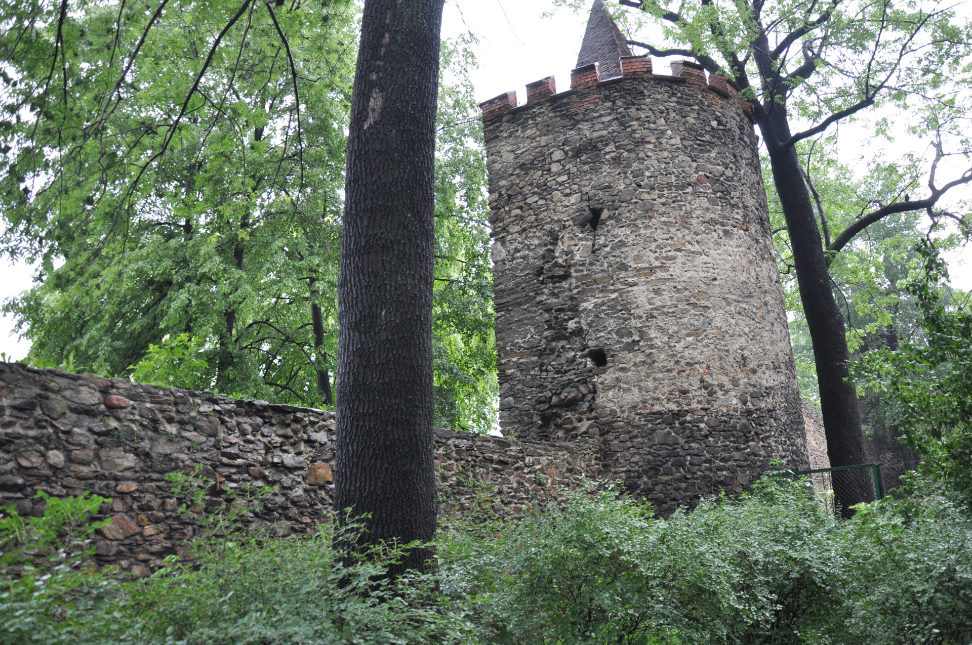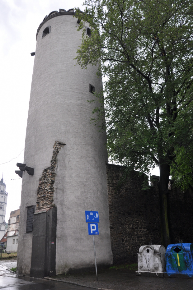 Fragment murów miejskich z basztą. W głębi - warowny kościół parafialny