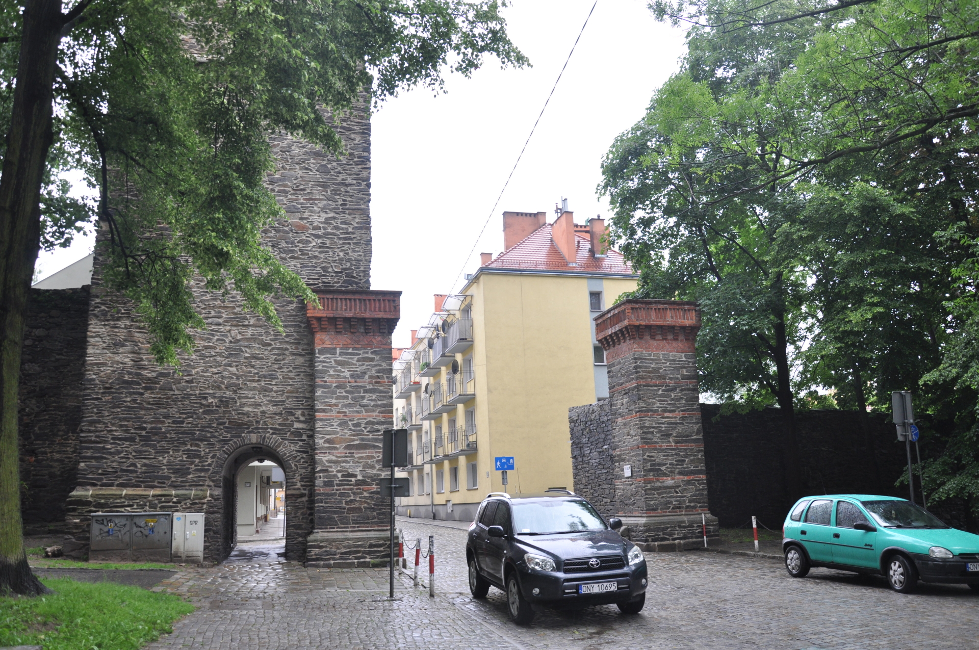 W murach miejskich istniały pierwotnie trzy bramy: Dolna (Wrocławska) po stronie północno-wschodniej, Górna (Kłodzka) po stronie południowo-zachodniej i Łaziebna (Ząbkowicka) po stronie północno-zachodniej. Po stronie południowo-wschodniej istniała ponadto tzw. furta zmarłych, usytuowana mniej więcej na wysokości kościoła parafialnego i prowadząca na położony poza murami miejskimi cmentarz. Obronę wszystkich trzech bram stanowiły wysokie wieże przybramne. W 1573 r. przebito w murach, po stronie południowo-wschodniej, czwartą bramę, znaną jako Brama Nowa lub Nyska. W przeciwieństwie do starszych bram nie była ona broniona przez wieżę.