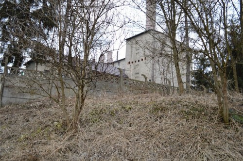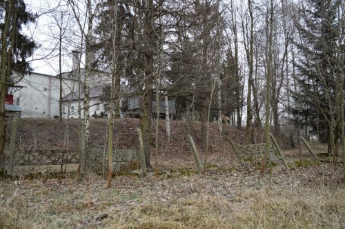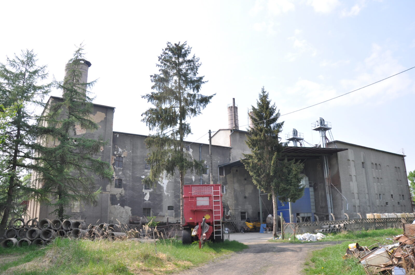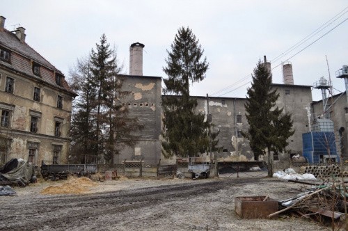 Widok na słodownie (dawny browar) wzniesiony w miejscu zamku. Obok opuszczony pałac.