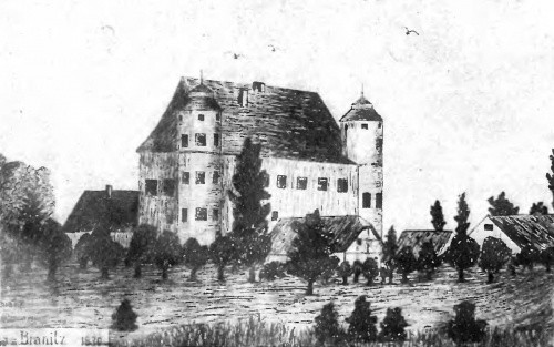 Miejscowość to dokładnie Branice - Zamek. Obiekt położony był w odległości 2 km od Branic przy moście granicznym na rzece Opawie. Zamek ten aktualnie nie istnieje, w jego miejscu obecnie znajduje się opuszczony pałac powstały na zrębach zamku. W Branicach był to chyba zamek murowany, bo o kamień nie było trudno. W sąsiedztwie zamku nad rzeką można jeszcze i dziś oglądać tzw. Skałki, czyli kamieniołomy, skąd brano kamień na budowę kościoła. Można, więc przyjąć, że i zamek wcześniejszy od kościoła był masywny. Był to zamek obronny i miał jakieś bliżej nieokreślone podziemne przejście do zamku na górze Cwilin koło Krnova po drugiej stronie rzeki.