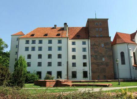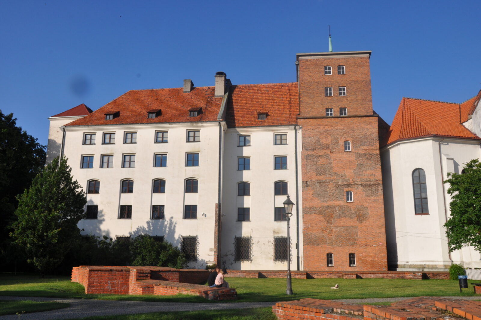 Widok ogólny na zespół zamkowy i zrekonstruowane fundamenty murów obronnych miasta.