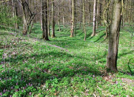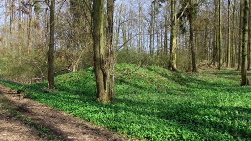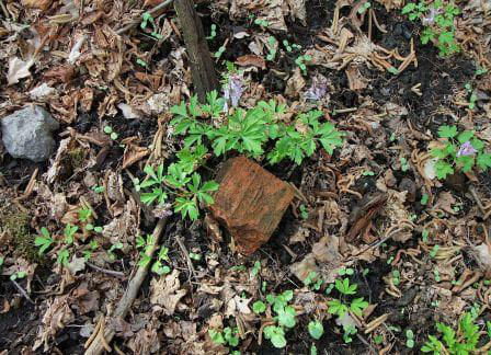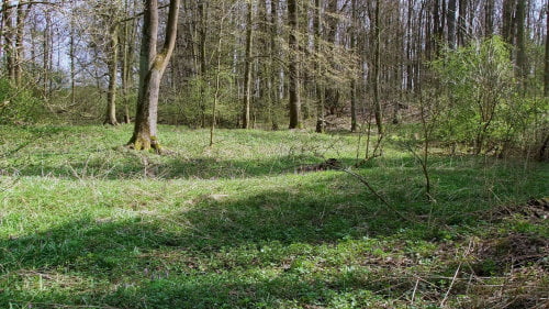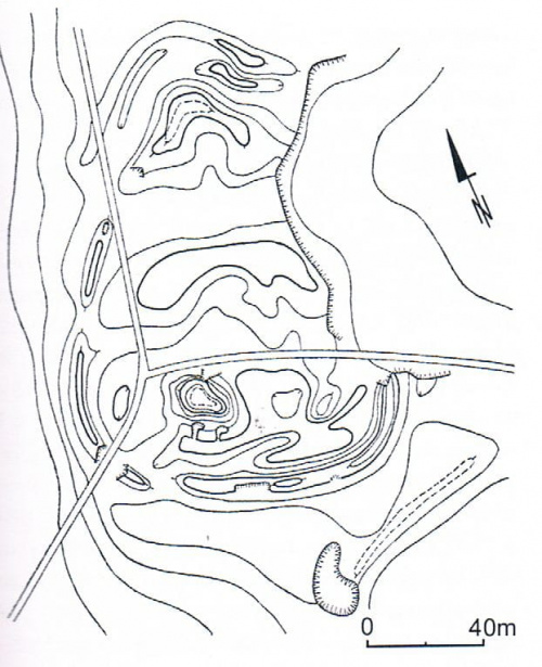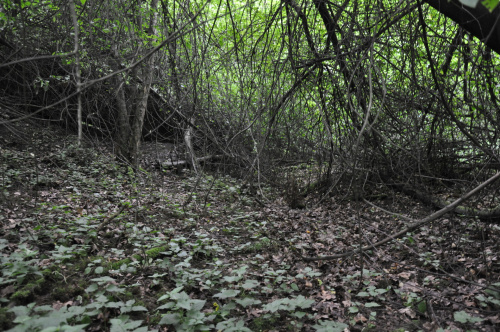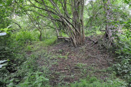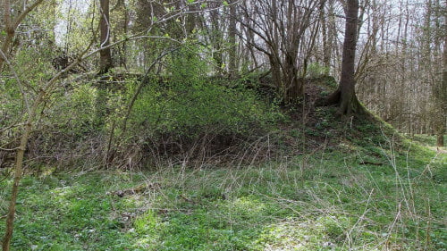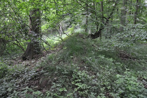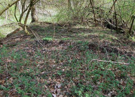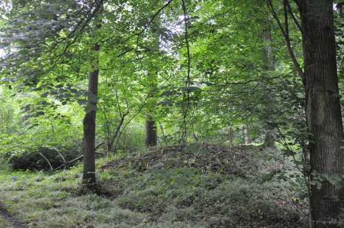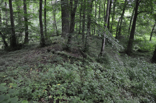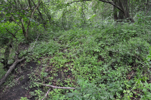 A co do zamku.. Kapitalnie zachował się kopiec, dobrze widoczne są także wały i fosa od północy. Niestety z powodu zalesienia obiekt nadaje się do zwiedzania tylko w porze bezlistnej. Reliktów murowanych brak, nie licząc walających się gdzieniegdzie kawałków cegieł i kamieni. (fot. kwiecień 2013)